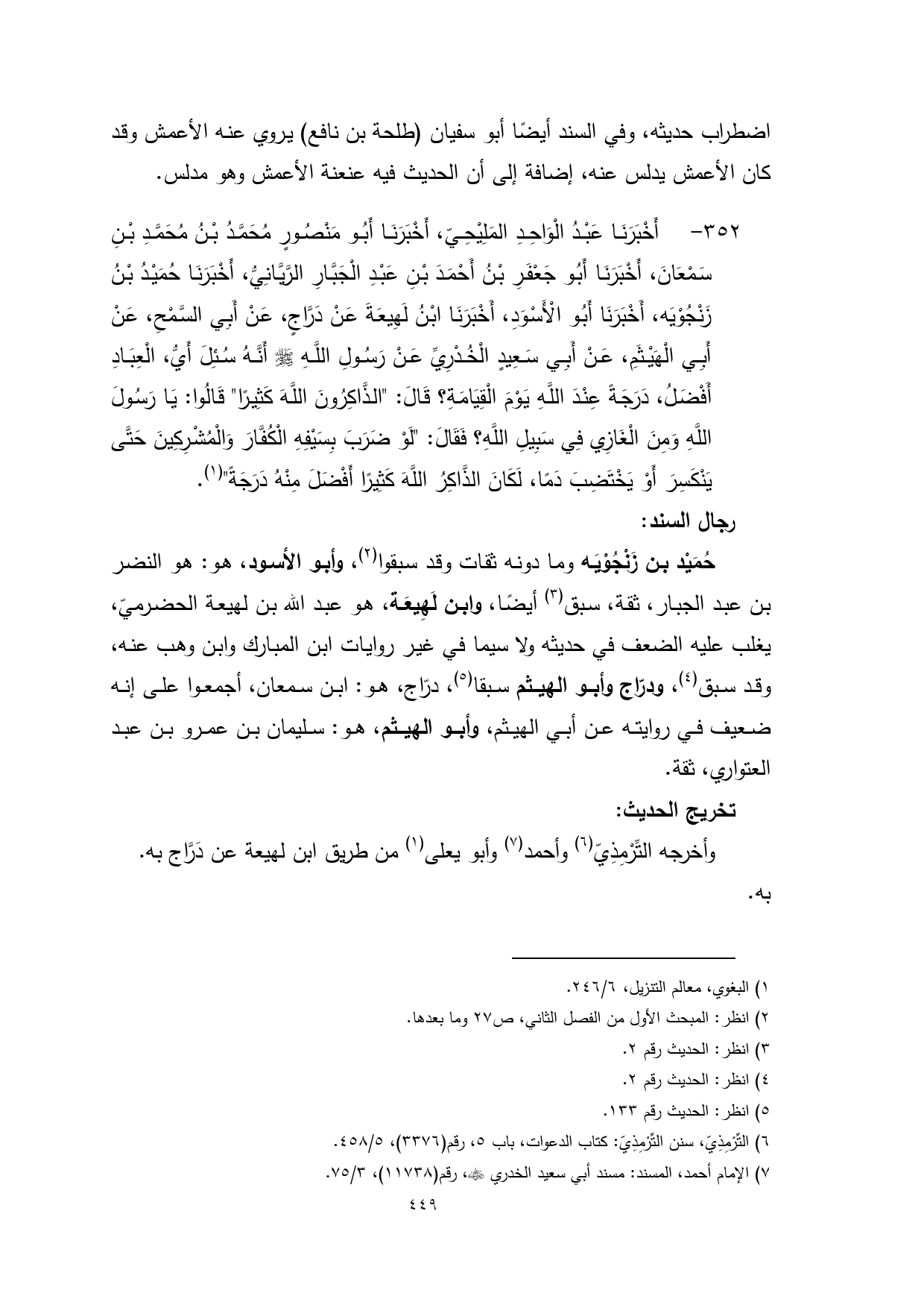 352 - أَخْبَرَنَا عَبْدُ الْوَاحِدِ المَلِيْحِيّ، أَخْبَرَنَا أَبُو مَنْصُورٍ مُحَمَّدُ بْنُ مُحَمَّدِ بْنِ سَمْعَانَ، أَخْبَرَنَا أَبُو جَعْفَرِ بْنُ أَحْمَدَ بْنِ عَبْدِ الْجَبَّارِ الرَّيَّانِيُّ، أَخْبَرَنَا حُمَيْدُ بْنُ زَنْجُوْيَه، أَخْبَرَنَا أَبُو الْأَسْوَدِ، أَخْبَرَنَا ابْنُ لَهِيعَةَ عَنْ دَرَّاجٍ، عَنْ أَبِي السَّمْحِ، عَنْ أَبِي الْهَيْثَمِ، عَنْ أَبِي سَعِيدٍ الْخُدْرِيِّ عَنْ رَسُولِ اللَّهِ - صلى الله عليه وسلم - أَنَّهُ سُئِلَ أَيُّ، الْعِبَادِ أَفْضَلُ، دَرَجَةً عِنْدَ اللَّهِ يَوْمَ الْقِيَامَةِ؟ قَالَ: "الذَّاكِرُونَ اللَّهَ كَثِيرًا" قَالُوا: يَا رَسُولَ اللَّهِ وَمِنَ الْغَازِي فِي سَبِيلِ اللَّهِ؟ فَقَالَ: "لَوْ ضَرَبَ بِسَيْفِهِ الْكُفَّارَ وَالْمُشْرِكِينَ حَتَّى يَنْكَسِرَ أَوْ يَخْتَضِبَ دَمًا، لَكَانَ الذَّاكِرُ اللَّهَ كَثِيرًا أَفْضَلَ مِنْهُ دَرَجَةً" (¬1).