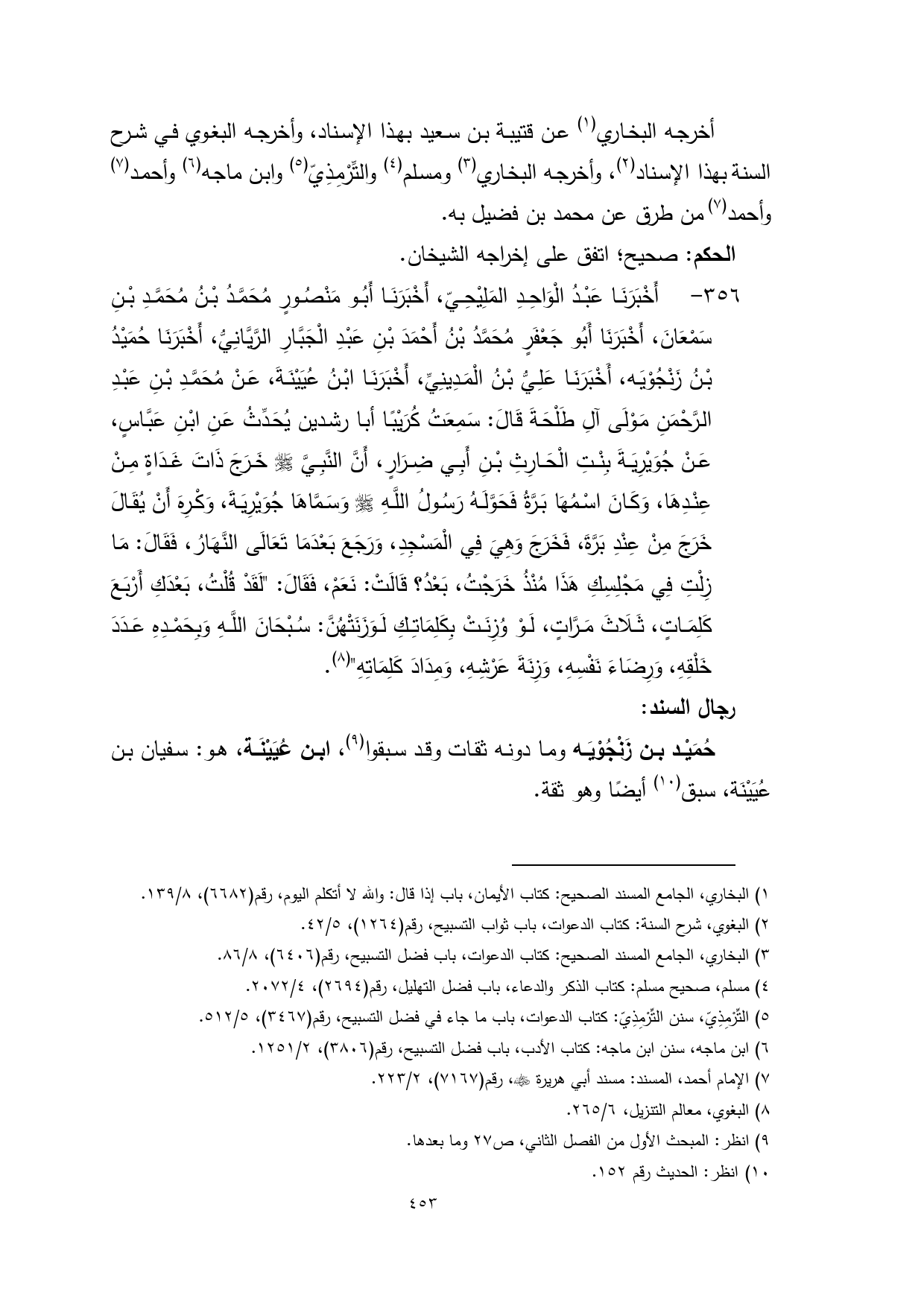 356 - أَخْبَرَنَا عَبْدُ الْوَاحِدِ المَلِيْحِيّ، أَخْبَرَنَا أَبُو مَنْصُورٍ مُحَمَّدُ بْنُ مُحَمَّدِ بْنِ سَمْعَانَ، أَخْبَرَنَا أَبُو جَعْفَرٍ مُحَمَّدُ بْنُ أَحْمَدَ بْنِ عَبْدِ الْجَبَّارِ الرَّيَّانِيُّ، أَخْبَرَنَا حُمَيْدُ بْنُ زَنْجُوْيَه، أَخْبَرَنَا عَلِيُّ بْنُ الْمَدِينِيِّ، أَخْبَرَنَا ابْنُ عُيَيْنَةَ، عَنْ مُحَمَّدِ بْنِ عَبْدِ الرَّحْمَنِ مَوْلَى آلِ طَلْحَةَ قَالَ: سَمِعَتُ كُرَيْبًا أبا رشدين يُحَدِّثُ عَنِ ابْنِ عَبَّاسٍ، عَنْ جُوَيْرِيَةَ بِنْتِ الْحَارِثِ بْنِ أَبِي ضِرَارٍ، أَنَّ النَّبِيَّ - صلى الله عليه وسلم - خَرَجَ ذَاتَ غَدَاةٍ مِنْ عِنْدِهَا، وَكَانَ اسْمُهَا بَرَّةُ فَحَوَّلَهُ رَسُولُ اللَّهِ - صلى الله عليه وسلم - وَسَمَّاهَا جُوَيْرِيَةَ، وَكْرِهَ أَنْ يُقَالَ خَرَجَ مِنْ عِنْدِ بَرَّةَ، فَخَرَجَ وَهِيَ فِي الْمَسْجِدِ، وَرَجَعَ بَعْدَمَا تَعَالَى النَّهَارُ، فَقَالَ: مَا زِلْتِ فِي مَجْلِسِكِ هَذَا مُنْذُ خَرَجْتُ، بَعْدُ؟ قَالَتْ: نَعَمْ، فَقَالَ: "لَقَدْ قُلْتُ، بَعْدَكِ أَرْبَعَ كَلِمَاتٍ، ثَلَاثَ مَرَّاتٍ، لَوْ وُزِنَتْ بِكَلِمَاتِكِ لَوَزَنَتْهُنَّ: سُبْحَانَ اللَّهِ وَبِحَمْدِهِ عَدَدَ خَلْقِهِ، وَرِضَاءَ نَفْسِهِ، وَزِنَةَ عَرْشِهِ، وَمِدَادَ كَلِمَاتِهِ" (¬8).