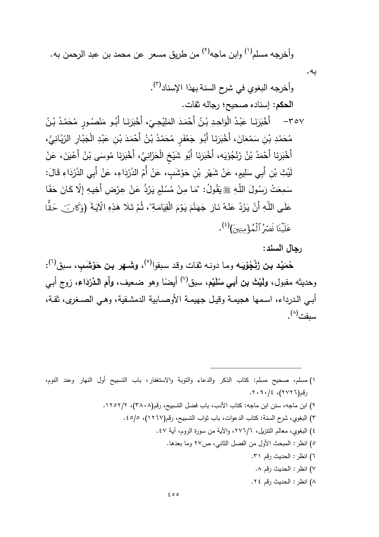 حُمَيْد بن زَنْجُوْيَه وما دونه ثقات وقد سبقوا (¬5)، وشهر بن حَوْشَبٍ، سبق (¬6): وحديثه مقبول، ولَيْث بن أبي سُلَيْم، سبق (¬7) أيضًا وهو ضعيف، وأَم الدَّرْدَاء، زوج أبي الدرداء، اسمها هجيمة وقيل جهيمة الأوصابية الدمشقية، وهي الصغرى، ثقة، سبقت (¬8).