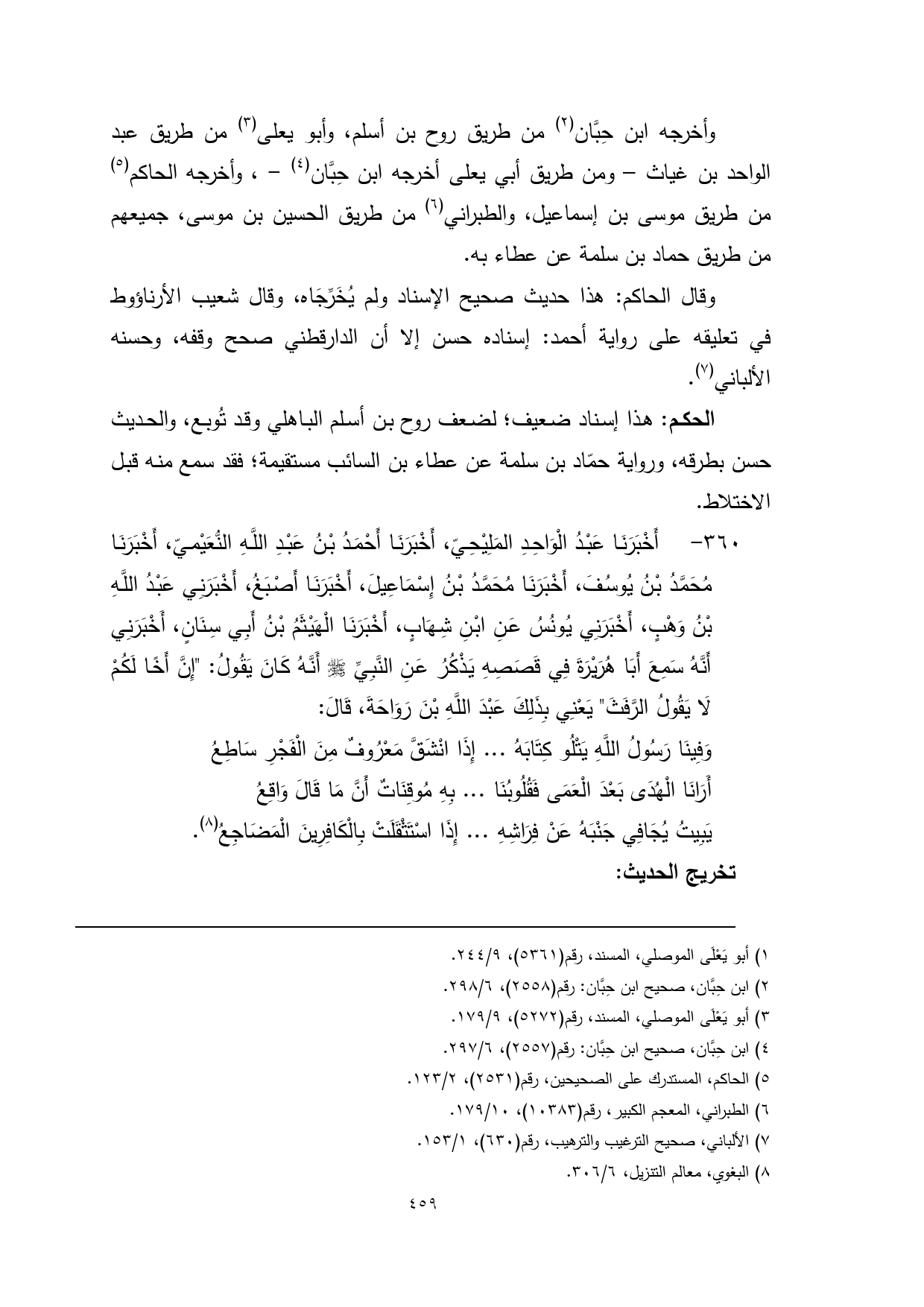 وأخرجه ابن حِبَّان (¬1) من طريق روح بن أسلم، وأبو يعلى (¬2) من طريق عبد الواحد بن غياث - ومن طريق أبي يعلى أخرجه ابن حِبَّان (¬3) -، وأخرجه الحاكم (¬4) من طريق موسى بن إسماعيل، والطبراني (¬5) من طريق الحسين بن موسى، جميعهم من طريق حماد بن سلمة عن عطاء به.
