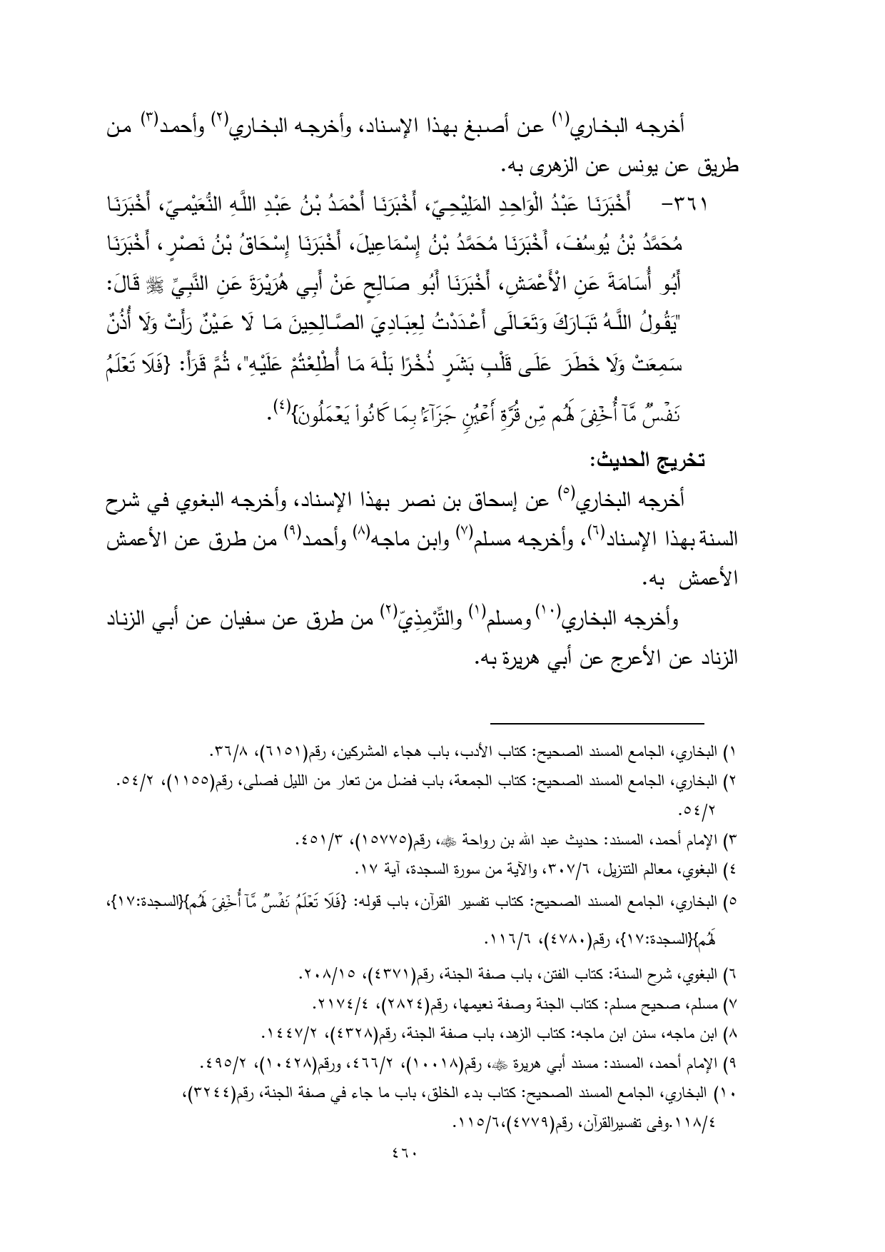 (¬5) البخاري، الجامع المسند الصحيح: كتاب تفسير القرآن، باب قوله: {فَلَا تَعْلَمُ نَفْسٌ مَا أُخْفِيَ لَهُمْ} {السجدة: 17}، رقم (4780)، 6/ 116.
