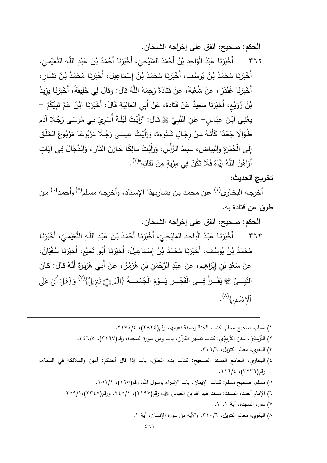 362 - أَخْبَرَنَا عَبْدُ الْوَاحِدِ بْنُ أَحْمَدَ المَلِيْحِيّ، أَخْبَرَنَا أَحْمَدُ بْنُ عَبْدِ اللَّهِ النُّعَيْميّ، أَخْبَرَنَا مُحَمَّدُ بْنُ يُوسُفَ، أَخْبَرَنَا مُحَمَّدُ بْنُ إِسْمَاعِيلَ، أَخْبَرَنَا مُحَمَّدُ بْنُ بَشَّارٍ، أَخْبَرَنَا غُنْدَرٌ، عَنْ شُعْبَةَ، عَنْ قَتَادَةَ رَحِمَهُ اللَّهُ قَالَ: وَقَالَ لِي خَلِيفَةُ، أَخْبَرَنَا يَزِيدُ بْنُ زُرَيْعٍ، أَخْبَرَنَا سَعِيدٌ عَنْ قَتَادَةَ، عَنْ أَبِي الْعَالِيَةِ قَالَ: أَخْبَرَنَا ابْنُ عَمِّ نَبِيِّكُمْ -يَعْنِي ابْنَ عَبَّاسٍ- عَنِ النَّبِيِّ - صلى الله عليه وسلم - قَالَ: "رَأَيْتُ لَيْلَةَ أُسَرِيَ بِي مُوسَى رَجُلًا آدَمَ طُوَالًا جَعْدًا كَأَنَّهُ مِنْ رِجَالِ شَنُوءَةَ، وَرَأَيْتُ عِيسَى رَجُلًا مَرْبُوعًا مَرْبُوعَ الْخَلْقِ إِلَى الْحُمْرَةِ والبياض، سبط الرَّأْسِ، وَرَأَيْتُ مَالِكًا خَازِنَ النَّارِ، وَالدَّجَّالَ فِي آيَاتٍ أَرَاهُنَّ اللَّهُ إِيَّاهُ فَلَا تَكُنْ فِي مِرْيَةٍ مِنْ لِقَائِهِ" (¬1).
