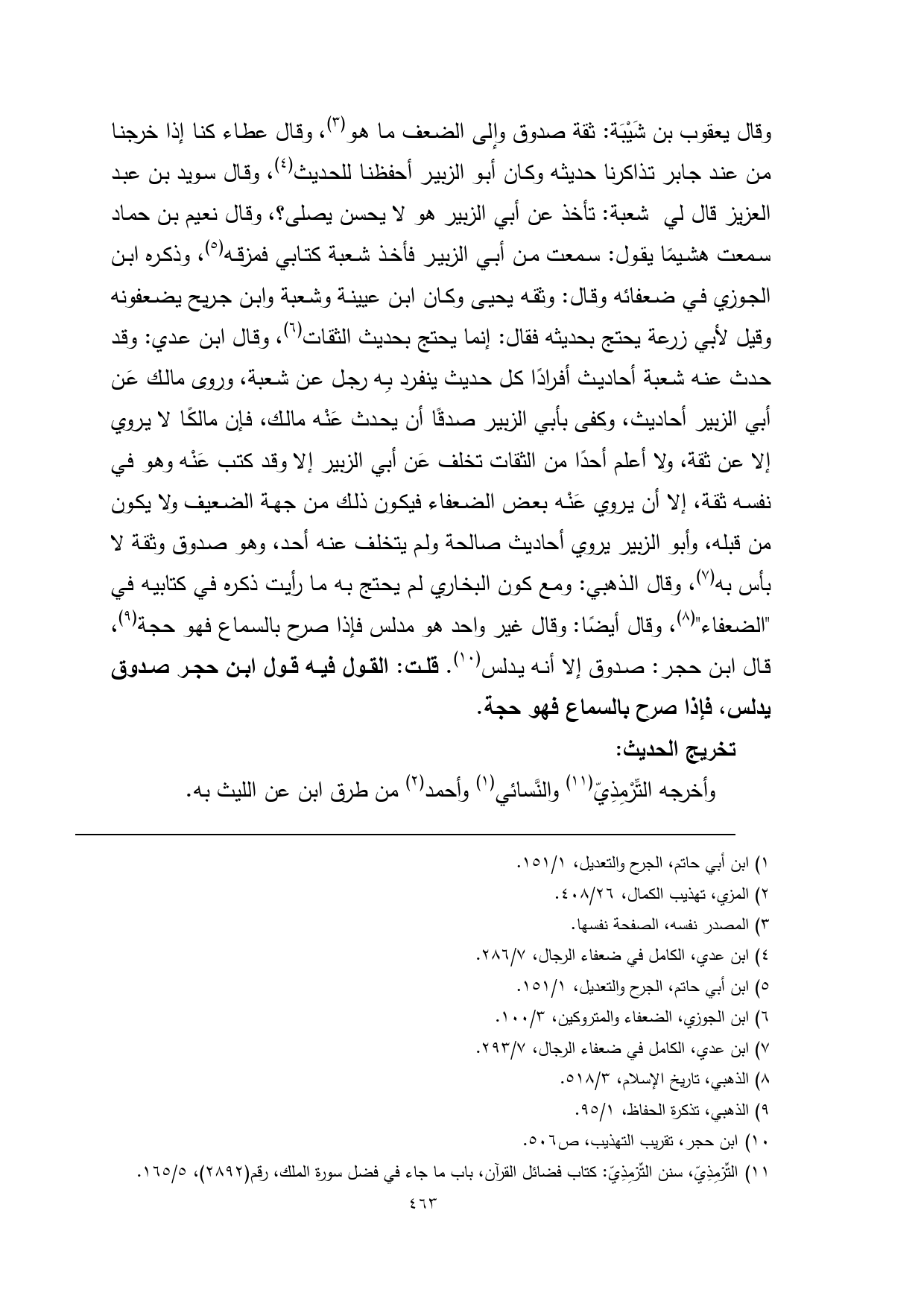 يعقوب بن شَيْبَة: ثقة صدوق وإلى الضعف ما هو (¬1)، وقال عطاء كنا إذا خرجنا من عند جابر تذاكرنا حديثه وكان أبو الزبير أحفظنا للحديث (¬2)، وقال سويد بن عبد العزيز قال لي شعبة: تأخذ عن أبي الزبير هو لا يحسن يصلى؟ ، وقال نعيم بن حماد سمعت هشيمًا يقول: سمعت من أبي الزبير فأخذ شعبة كتابي فمزقه (¬3)، وذكره ابن الجوزي في ضعفائه وقال: وثقه يحيى وكان ابن عيينة وشعبة وابن جريح يضعفونه وقيل لأبي زرعة يحتج بحديثه فقال: إنما يحتج بحديث الثقات (¬4)، وقال ابن عدي: وقد حدث عنه شعبة أحاديث أفرادًا كل حديث ينفرد بِه رجل عن شعبة، وروى مالك عَن أبي الزبير أحاديث، وكفى بأبي الزبير صدقًا أن يحدث عَنْه مالك، فإن مالكًا لا يروي إلا عن ثقة، ولا أعلم أحدًا من الثقات تخلف عَن أبي الزبير إلا وقد كتب عَنْه وهو في نفسه ثقة، إلا أن يروي عَنْه بعض الضعفاء فيكون ذلك من جهة الضعيف ولا يكون من قبله، وأبو الزبير يروي أحاديث صالحة ولم يتخلف عنه أحد، وهو صدوق وثقة لا بأس به (¬5)، وقال الذهبي: ومع كون البخاري لم يحتج به ما رأيت ذكره في كتابيه في "الضعفاء" (¬6)، وقال أيضًا: وقال غير واحد هو مدلس فإذا صرح بالسماع فهو حجة (¬7)، قال ابن حجر: صدوق إلا أنه يدلس (¬8). قلت: القول فيه قول ابن حجر صدوق يدلس، فإذا صرح بالسماع فهو حجة.