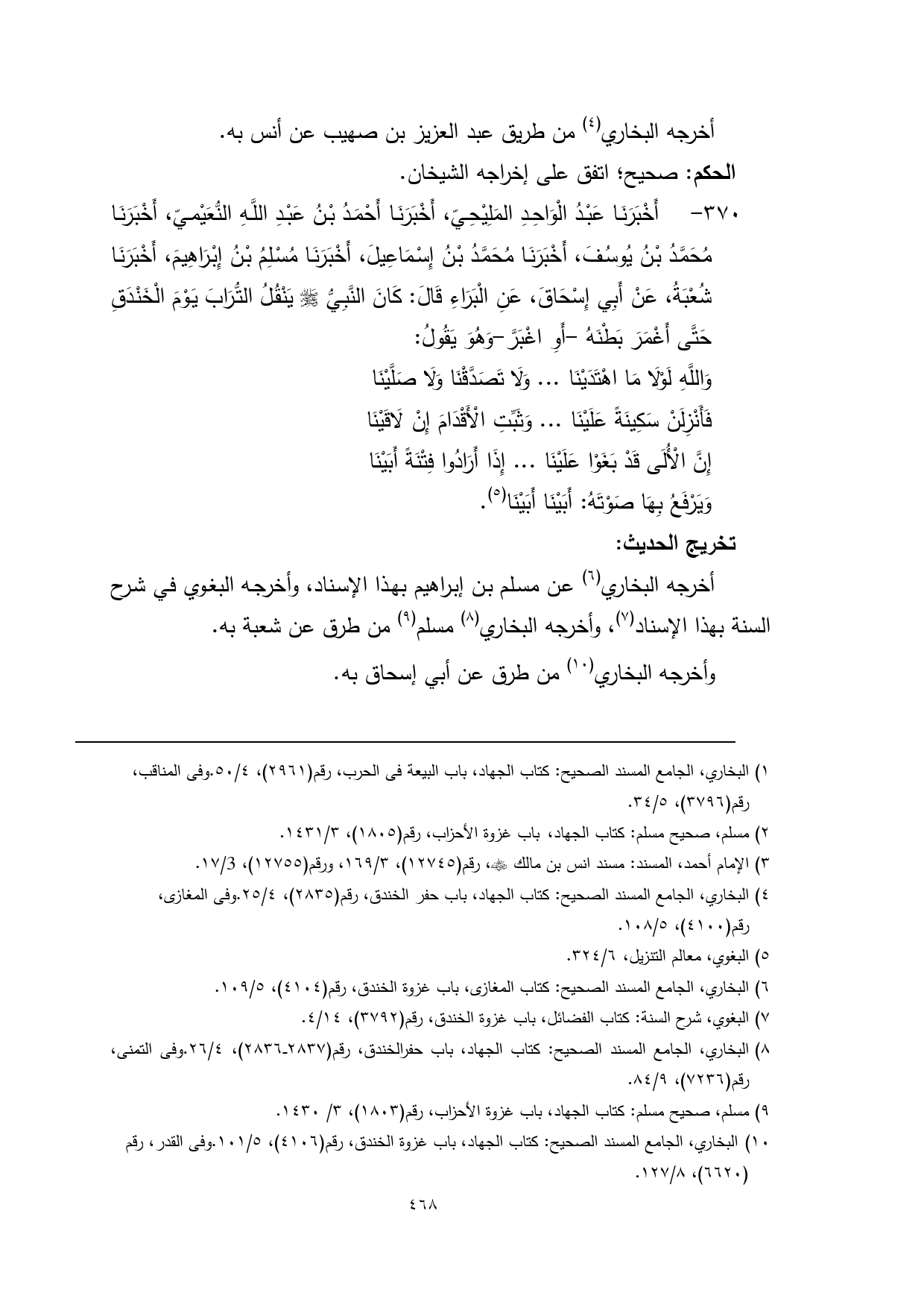 (¬1) البخاري، الجامع المسند الصحيح: كتاب الجهاد، باب حفر الخندق، رقم (2835)، 4/ 25.وفى المغازى، رقم (4100)، 5/ 108.