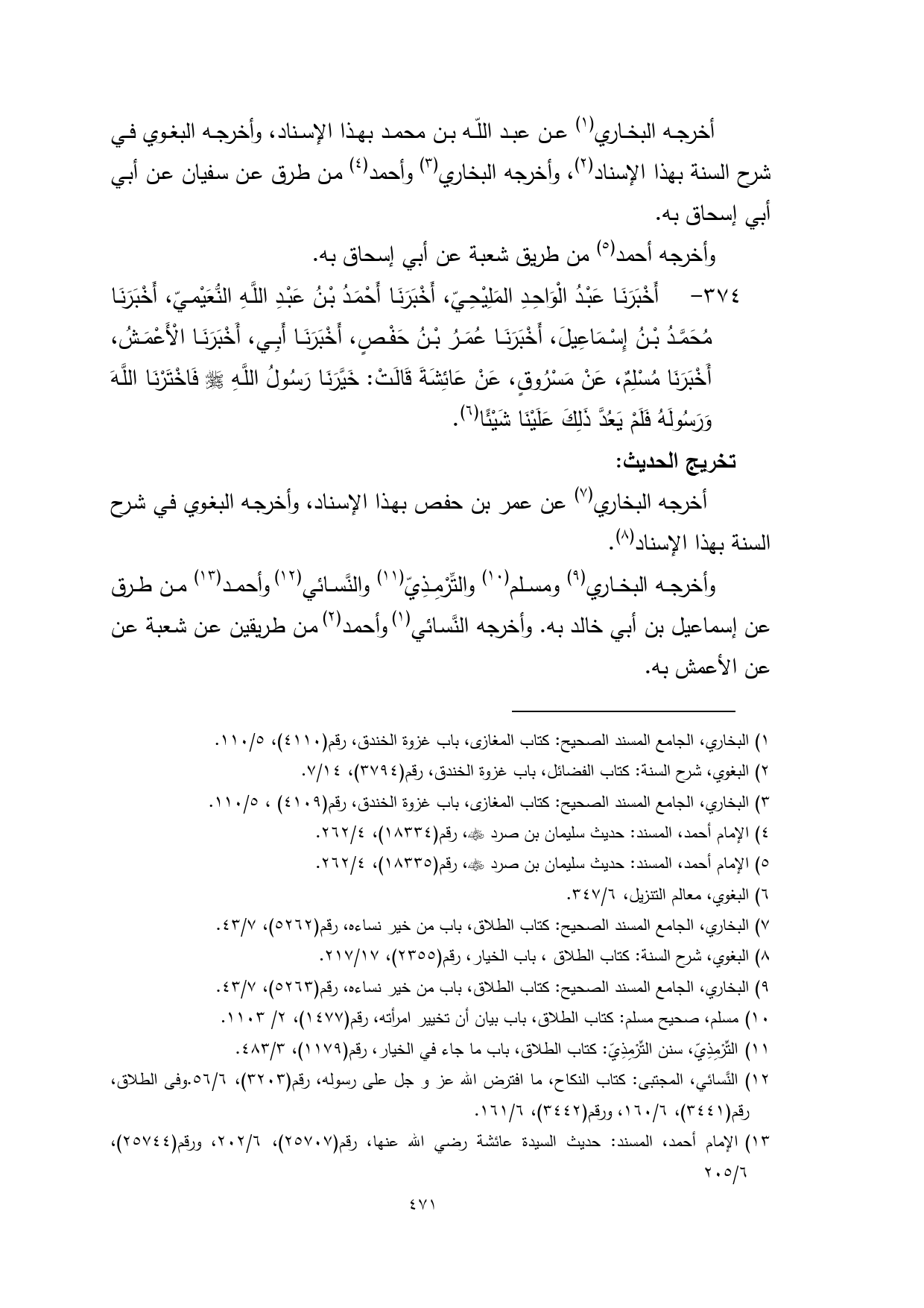374 - أَخْبَرَنَا عَبْدُ الْوَاحِدِ المَلِيْحِيّ، أَخْبَرَنَا أَحْمَدُ بْنُ عَبْدِ اللَّهِ النُّعَيْميّ، أَخْبَرَنَا مُحَمَّدُ بْنُ إِسْمَاعِيلَ، أَخْبَرَنَا عُمَرُ بْنُ حَفْصٍ، أَخْبَرَنَا أَبِي، أَخْبَرَنَا الْأَعْمَشُ، أَخْبَرَنَا مُسْلِمٌ، عَنْ مَسْرُوقٍ، عَنْ عَائِشَةَ قَالَتْ: خَيَّرَنَا رَسُولُ اللَّهِ - صلى الله عليه وسلم - فَاخْتَرْنَا اللَّهَ وَرَسُولَهُ فَلَمْ يَعُدَّ ذَلِكَ عَلَيْنَا شَيْئًا (¬6).