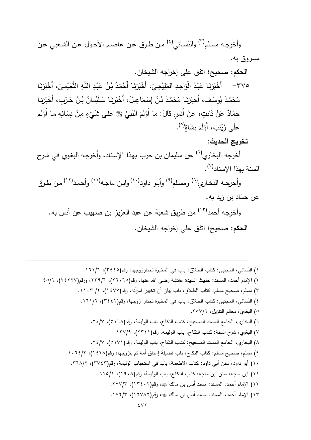 375 - أَخْبَرَنَا عَبْدُ الْوَاحِدِ المَلِيْحِيّ، أَخْبَرَنَا أَحْمَدُ بْنُ عَبْدِ اللَّهِ النُّعَيْميّ، أَخْبَرَنَا مُحَمَّدُ يُوسُفَ، أَخْبَرَنَا مُحَمَّدُ بْنُ إِسْمَاعِيلَ، أَخْبَرَنَا سُلَيْمَانُ بْنُ حَرْبٍ، أَخْبَرَنَا حَمَّادٌ عَنْ ثَابِتٍ، عَنْ أَنَسٍ قَالَ: مَا أَوْلَمَ النَّبِيُّ - صلى الله عليه وسلم - عَلَى شَيْءٍ مِنْ نِسَائِهِ مَا أَوْلَمَ عَلَى زَيْنَبَ، أَوْلَمَ بِشَاةٍ (¬3).