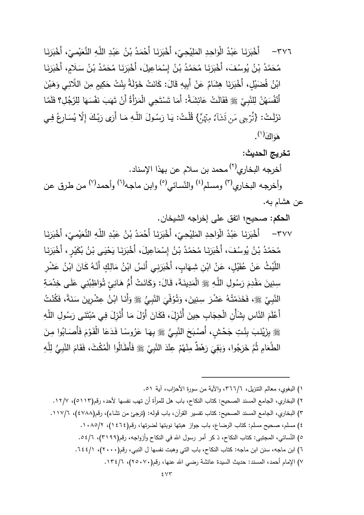 376 - أَخْبَرَنَا عَبْدُ الْوَاحِدِ المَلِيْحِيّ، أَخْبَرَنَا أَحْمَدُ بْنُ عَبْدِ اللَّهِ النُّعَيْميّ، أَخْبَرَنَا مُحَمَّدُ بْنُ يُوسُفَ، أَخْبَرَنَا مُحَمَّدُ بْنُ إِسْمَاعِيلَ، أَخْبَرَنَا مُحَمَّدُ بْنُ سَلَامٍ، أَخْبَرَنَا ابْنُ فُضَيْلٍ، أَخْبَرَنَا هِشَامٌ عَنْ أَبِيهِ قَالَ: كَانَتْ خَوْلَةُ بِنْتُ حَكِيمٍ مِنَ اللَّائِي وَهَبْنَ أَنْفُسَهُنَّ لِلنَّبِيِّ - صلى الله عليه وسلم - فَقَالَتْ عَائِشَةُ: أَمَا تَسْتَحِي الْمَرْأَةُ أَنْ تَهَبَ نَفْسَهَا لِلرَّجُلِ؟ فَلَمَّا نَزَلَتْ: {تُرْجِي مَنْ تَشَاءُ مِنْهُنَّ} قُلْتُ: يَا رَسُولَ اللَّهِ مَا أَرَى رَبَّكَ إِلَّا يُسَارِعُ فِي هَوَاكَ (¬1).