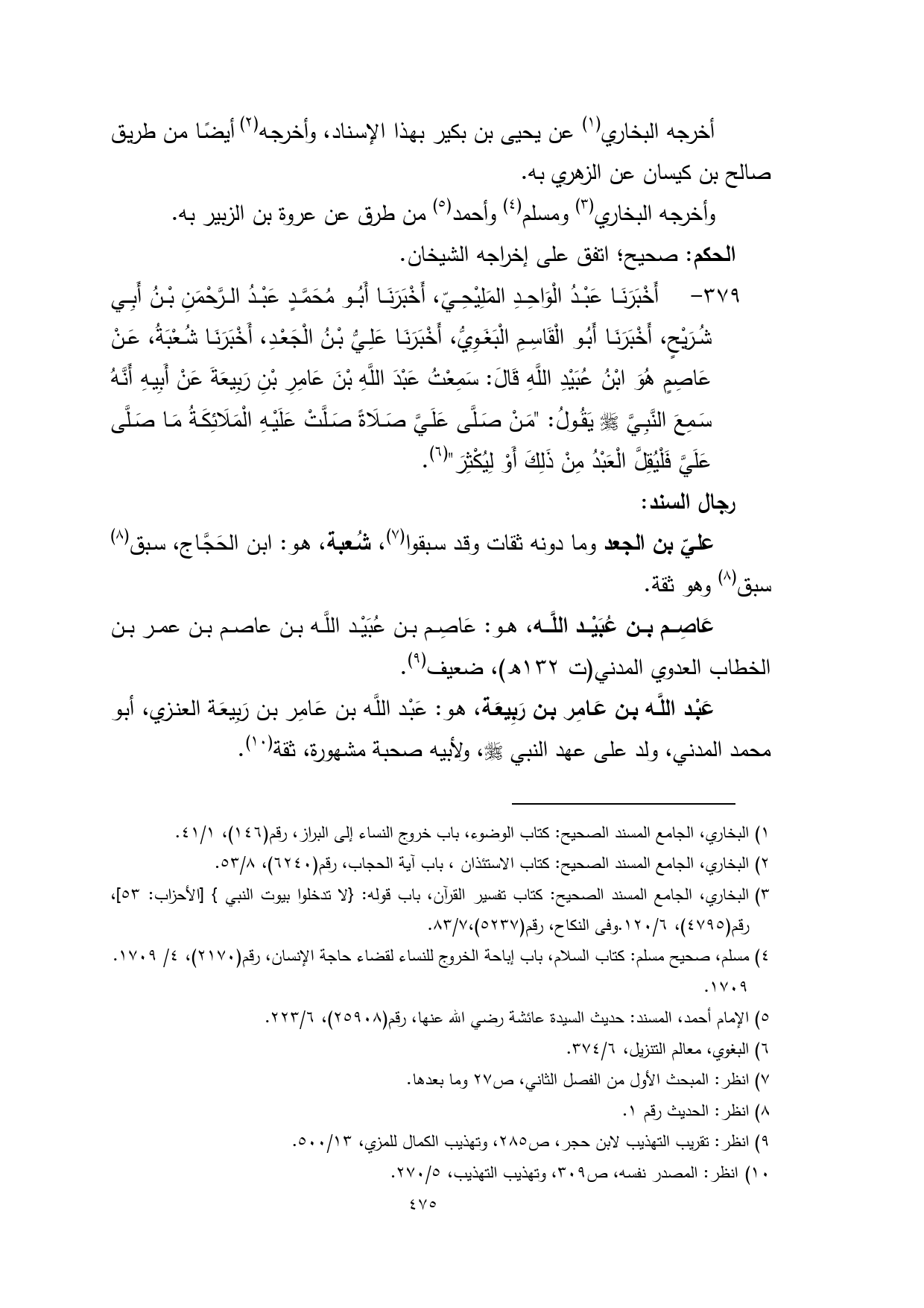 379 - أَخْبَرَنَا عَبْدُ الْوَاحِدِ المَلِيْحِيّ، أَخْبَرَنَا أَبُو مُحَمَّدٍ عَبْدُ الرَّحْمَنِ بْنُ أَبِي شُرَيْحٍ، أَخْبَرَنَا أَبُو الْقَاسِمِ الْبَغَوِيُّ، أَخْبَرَنَا عَلِيُّ بْنُ الْجَعْدِ، أَخْبَرَنَا شُعْبَةُ، عَنْ عَاصِمٍ هُوَ ابْنُ عُبَيْدِ اللَّهِ قَالَ: سَمِعْتُ عَبْدَ اللَّهِ بْنَ عَامِرِ بْنِ رَبِيعَةَ عَنْ أَبِيهِ أَنَّهُ سَمِعَ النَّبِيَّ - صلى الله عليه وسلم - يَقُولُ: "مَنْ صَلَّى عَلَيَّ صَلَاةً صَلَّتْ عَلَيْهِ الْمَلَائِكَةُ مَا صَلَّى عَلَيَّ فَلْيُقِلَّ الْعَبْدُ مِنْ ذَلِكَ أَوْ لِيُكْثِرَ" (¬6).