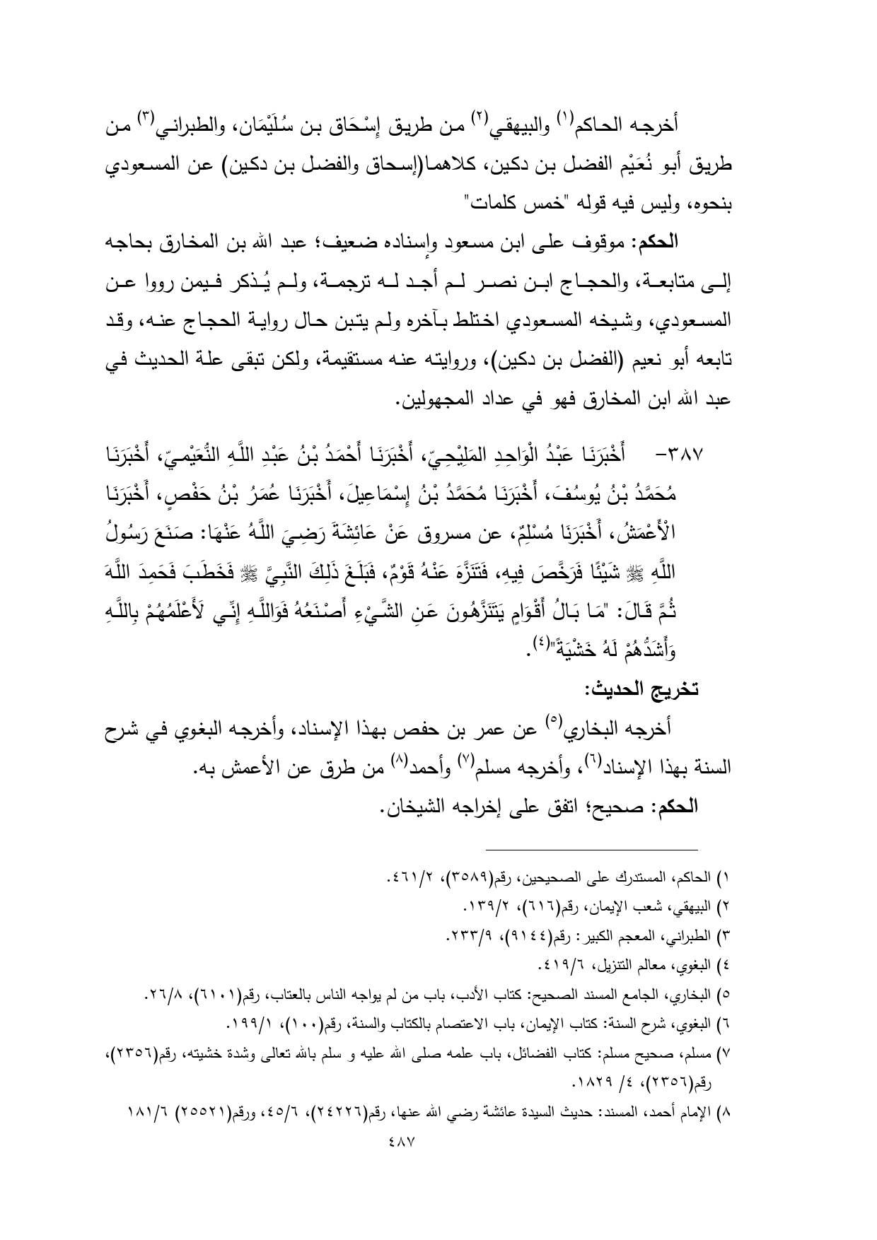 387 - أَخْبَرَنَا عَبْدُ الْوَاحِدِ المَلِيْحِيّ، أَخْبَرَنَا أَحْمَدُ بْنُ عَبْدِ اللَّهِ النُّعَيْميّ، أَخْبَرَنَا مُحَمَّدُ بْنُ يُوسُفَ، أَخْبَرَنَا مُحَمَّدُ بْنُ إِسْمَاعِيلَ، أَخْبَرَنَا عُمَرُ بْنُ حَفْصٍ، أَخْبَرَنَا الْأَعْمَشُ، أَخْبَرَنَا مُسْلِمٌ، عن مسروق عَنْ عَائِشَةَ رَضِيَ اللَّهُ عَنْهَا: صَنَعَ رَسُولُ اللَّهِ - صلى الله عليه وسلم - شَيْئًا فَرَخَّصَ فِيهِ، فَتَنَزَّهَ عَنْهُ قَوْمٌ، فَبَلَغَ ذَلِكَ النَّبِيَّ - صلى الله عليه وسلم - فَخَطَبَ فَحَمِدَ اللَّهَ ثُمَّ قَالَ: "مَا بَالُ أَقْوَامٍ يَتَنَزَّهُونَ عَنِ الشَّيْءِ أَصْنَعُهُ فَوَاللَّهِ إِنِّي لَأَعْلَمُهُمْ بِاللَّهِ وَأَشَدُّهُمْ لَهُ خَشْيَةً" (¬4).