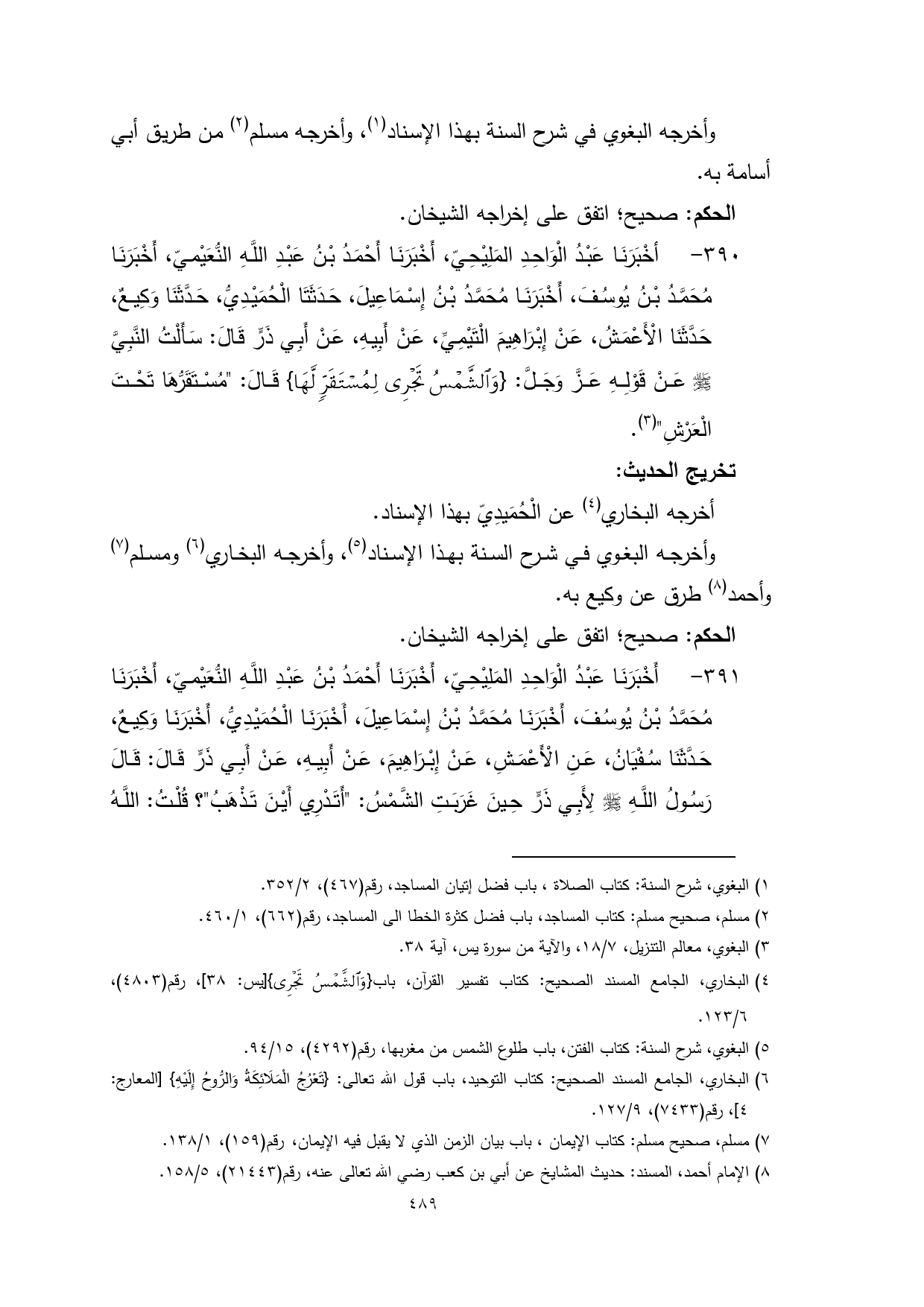 390 - أخْبَرَنَا عَبْدُ الْوَاحِدِ المَلِيْحِيّ، أَخْبَرَنَا أَحْمَدُ بْنُ عَبْدِ اللَّهِ النُّعَيْميّ، أَخْبَرَنَا مُحَمَّدُ بْنُ يُوسُفَ، أَخْبَرَنَا مُحَمَّدُ بْنُ إِسْمَاعِيلَ، حَدَثَتَا الْحُمَيْدِيُّ، حَدَّثَنَا وَكِيعٌ، حَدَّثَنَا الْأَعْمَشُ، عَنْ إِبْرَاهِيمَ الْتَيْمِيِّ، عَنْ أَبِيهِ، عَنْ أَبِي ذَرٍّ قَالَ: سَأَلْتُ النَّبِيَّ - صلى الله عليه وسلم - عَنْ قَوْلِهِ عَزَّ وَجَلَّ: {وَالشَّمْسُ تَجْرِي لِمُسْتَقَرٍّ لَهَا} قَالَ: "مُسْتَقَرُّهَا تَحْتَ الْعَرْشِ" (¬3).
