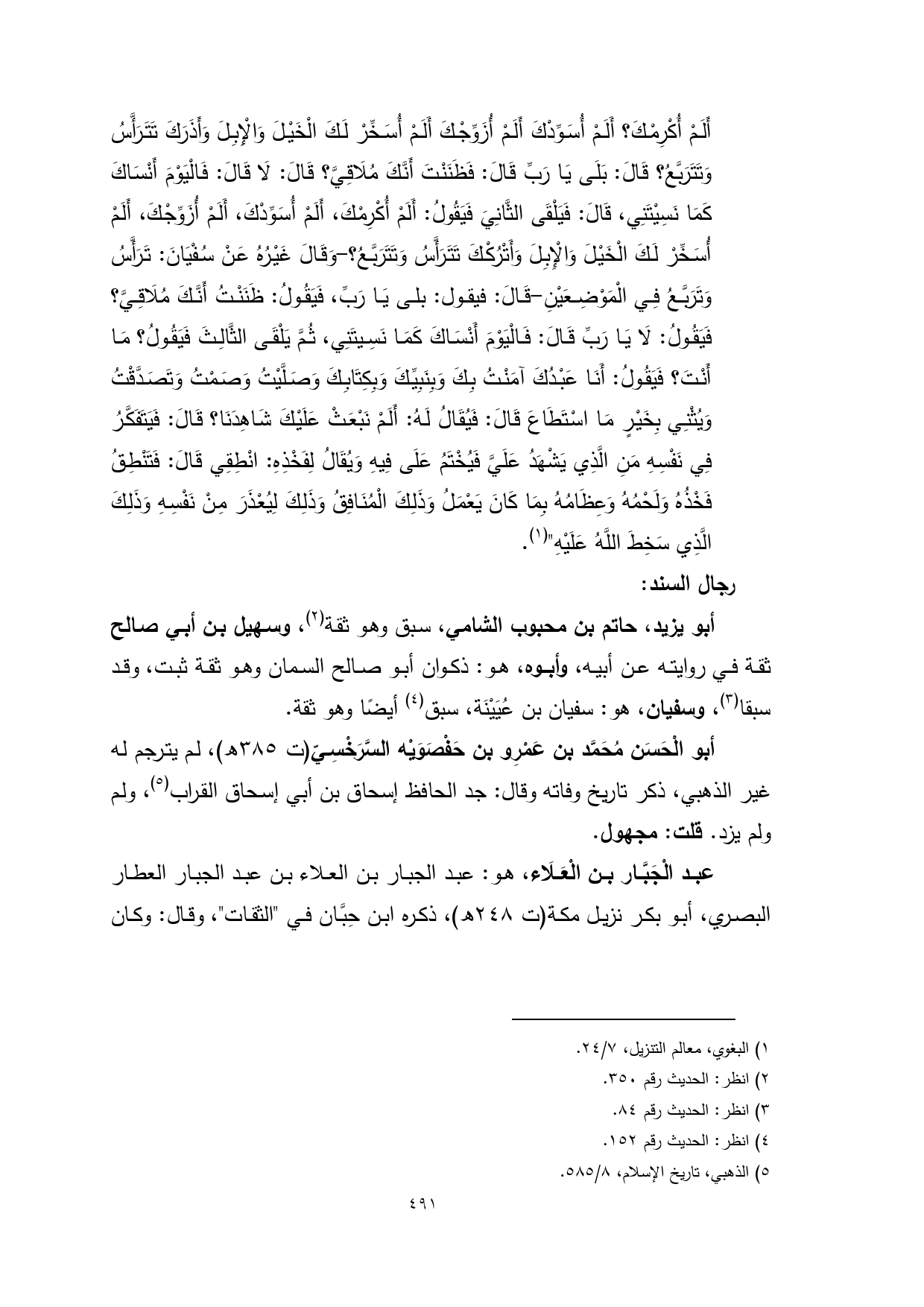 أبو يزيد، حاتم بن محبوب الشامي، سبق وهو ثقة (¬2)، وسهيل بن أبي صالح ثقة في روايته عن أبيه، وأبوه، هو: ذكوان أبو صالح السمان وهو ثقة ثبت، وقد سبقا (¬3)، وسفيان، هو: سفيان بن عُيَيْنَة، سبق (¬4) أيضًا وهو ثقة.