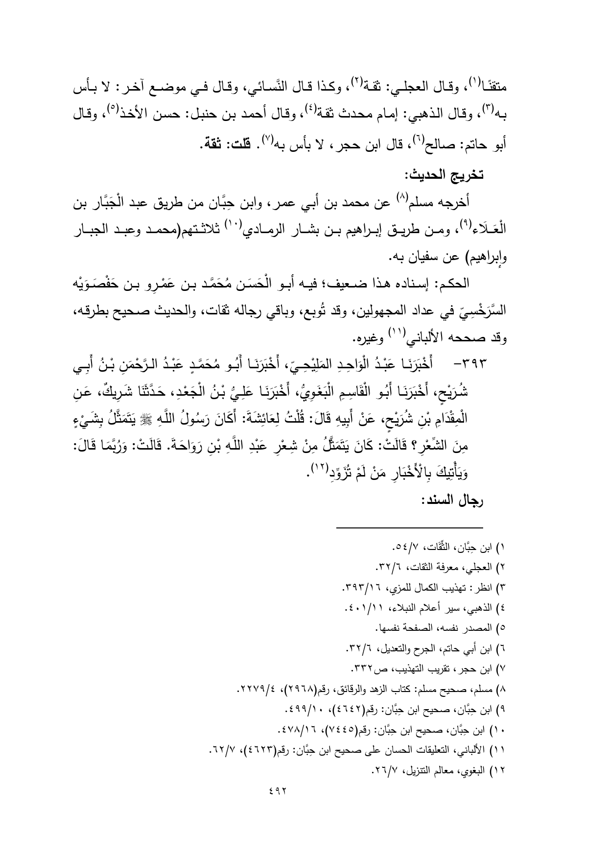 393 - أَخْبَرَنَا عَبْدُ الْوَاحِدِ المَلِيْحِيّ، أَخْبَرَنَا أَبُو مُحَمَّدٍ عَبْدُ الرَّحْمَنِ بْنُ أَبِي شُرَيْحٍ، أَخْبَرَنَا أَبُو الْقَاسِمِ الْبَغَوِيُّ، أَخْبَرَنَا عَلِيُّ بْنُ الْجَعْدِ، حَدَّثَنَا شَرِيكٌ، عَنِ الْمِقْدَامِ بْنِ شُرَيْحٍ، عَنْ أَبِيهِ قَالَ: قُلْتُ لِعَائِشَةَ: أَكَانَ رَسُولُ اللَّهِ - صلى الله عليه وسلم - يَتَمَثَّلُ بِشَيْءٍ مِنَ الشِّعْرِ؟ قَالَتْ: كَانَ يَتَمَثَّلُ مِنْ شِعْرِ عَبْدِ اللَّهِ بْنِ رَوَاحَةَ. قَالَتْ: وَرُبَّمَا قَالَ: وَيَأْتِيكَ بِالْأَخْبَارِ مَنْ لَمْ تُزَوِّدِ (¬12).