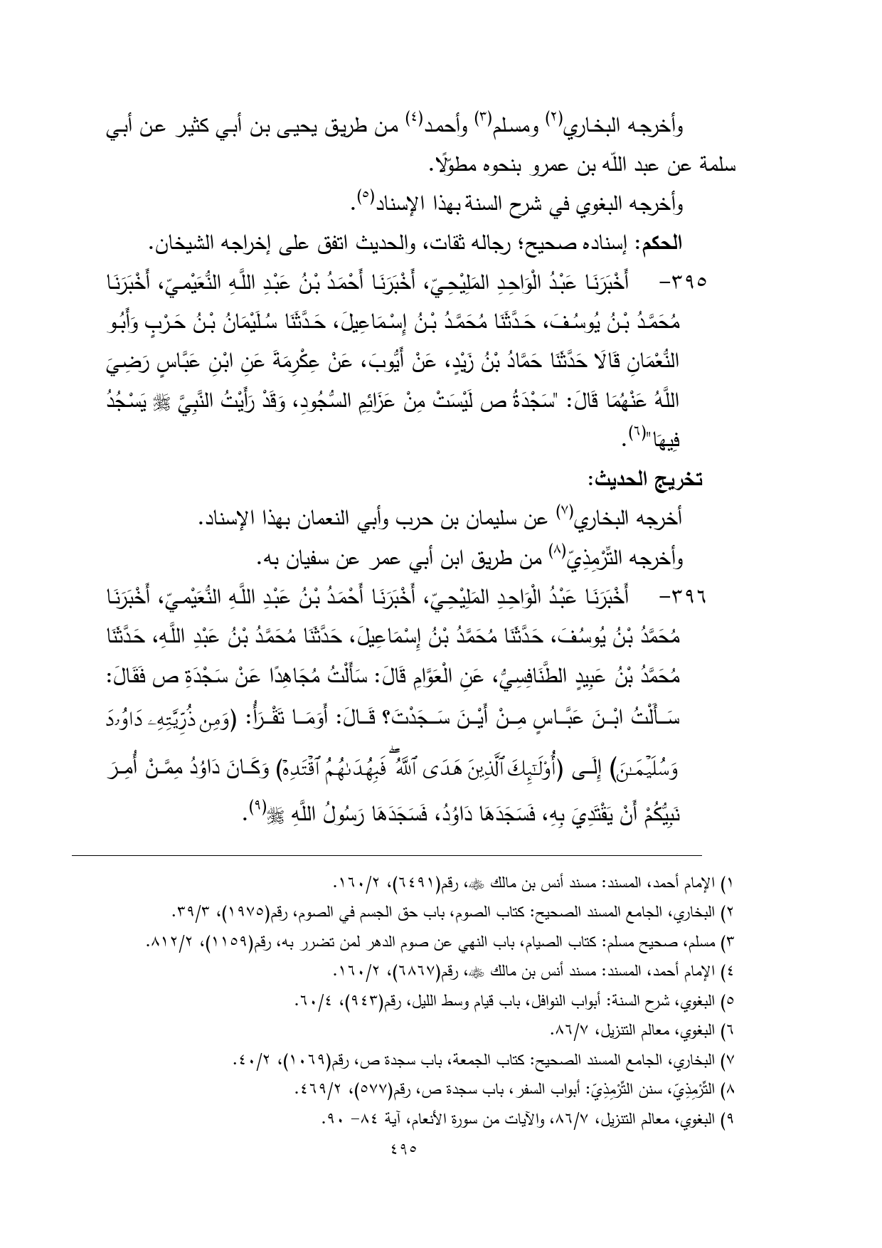 395 - أَخْبَرَنَا عَبْدُ الْوَاحِدِ المَلِيْحِيّ، أَخْبَرَنَا أَحْمَدُ بْنُ عَبْدِ اللَّهِ النُّعَيْميّ، أَخْبَرَنَا مُحَمَّدُ بْنُ يُوسُفَ، حَدَّثَنَا مُحَمَّدُ بْنُ إِسْمَاعِيلَ، حَدَّثَنَا سُلَيْمَانُ بْنُ حَرْبٍ وَأَبُو النُّعْمَانِ قَالَا حَدَّثَنَا حَمَّادُ بْنُ زَيْدٍ، عَنْ أَيُّوبَ، عَنْ عِكْرِمَةَ عَنِ ابْنِ عَبَّاسٍ رَضِيَ اللَّهُ عَنْهُمَا قَالَ: "سَجْدَةُ ص لَيْسَتْ مِنْ عَزَائِمِ السُّجُودِ، وَقَدْ رَأَيْتُ النَّبِيَّ - صلى الله عليه وسلم - يَسْجُدُ فِيهَا" (¬5).
