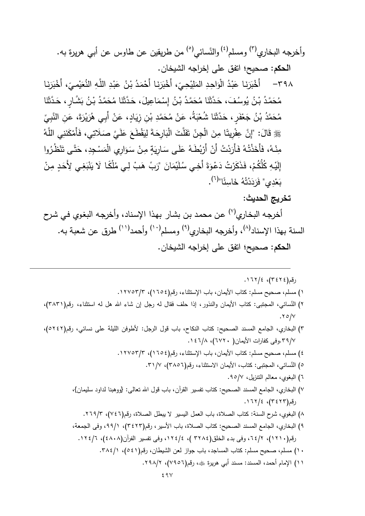398 - أَخْبَرَنَا عَبْدُ الْوَاحِدِ المَلِيْحِيّ، أَخْبَرَنَا أَحْمَدُ بْنُ عَبْدِ اللَّهِ النُّعَيْميّ، أَخْبَرَنَا مُحَمَّدُ بْنُ يُوسُفَ، حَدَّثَنَا مُحَمَّدُ بْنُ إِسْمَاعِيلَ، حَدَّثَنَا مُحَمَّدُ بْنُ بَشَّارٍ، حَدَّثَنَا مُحَمَّدُ بْنُ جَعْفَرٍ، حَدَّثَنَا شُعْبَةُ، عَنْ مُحَمَّدِ بْنِ زِيَادٍ، عَنْ أَبِي هُرَيْرَةَ، عَنِ النَّبِيِّ - صلى الله عليه وسلم - قَالَ: "إِنَّ عِفْرِيتًا مِنَ الْجِنِّ تَفَلَّتَ الْبَارِحَةَ لِيَقْطَعَ عَلَيَّ صَلَاتِي، فَأَمْكَنَنِي اللَّهُ مِنْهُ، فَأَخَذْتُهُ فَأَرَدْتُ أَنْ أَرْبُطَهُ عَلَى سَارِيَةٍ مِنْ سَوَارِي الْمَسْجِدِ، حَتَّى تَنْظُرُوا إِلَيْهِ كُلُّكُمْ، فَذَكَرْتُ دَعْوَةَ أَخِي سُلَيْمَانَ "رَبِّ هَبْ لِي مُلْكًا لَا يَنْبَغِي لِأَحَدٍ مِنْ بَعْدِي" فَرَدَدْتُهُ خَاسِئًا" (¬4).