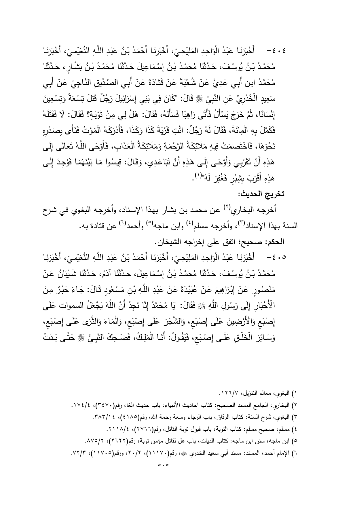 404 - أَخْبَرَنَا عَبْدُ الْوَاحِدِ المَلِيْحِيّ، أَخْبَرَنَا أَحْمَدُ بْنُ عَبْدِ اللَّهِ النُّعَيْميّ، أَخْبَرَنَا مُحَمَّدُ بْنُ يُوسُفَ، حَدَّثَنَا مُحَمَّدُ بْنُ إِسْمَاعِيلَ حَدَّثَنَا مُحَمَّدُ بْنُ بَشَّارٍ، حَدَّثَنَا مُحَمَّدُ ابن أَبِي عَدِيٍّ عَنْ شُعْبَةَ عَنْ قَتَادَةَ عَنْ أَبِي الصِّدِّيقِ النَّاجِيِّ عَنْ أَبِي سَعِيدٍ الْخُدْرِيِّ عَنِ النَّبِيِّ - صلى الله عليه وسلم - قَالَ: "كَانَ فِي بَنِي إِسْرَائِيلَ رَجُلٌ قَتَلَ تِسْعَةً وَتِسْعِينَ إِنْسَانًا، ثُمَّ خَرَجَ يَسْأَلُ فَأَتَى رَاهِبًا فَسَأَلَهُ، فَقَالَ: هَلْ لِي مِنْ تَوْبَةٍ؟ فَقَالَ: لَا فَقَتَلَهُ فَكَمَّلَ بِهِ الْمِائَةَ، فَقَالَ لَهُ رَجُلٌ: ائْتِ قَرْيَةَ كَذَا وَكَذَا، فَأَدْرَكَهُ الْمَوْتُ فَنَأَى بِصَدْرِهِ نَحْوَهَا، فَاخْتَصَمَتْ فِيهِ مَلَائِكَةُ الرَّحْمَةِ وَمَلَائِكَةُ الْعَذَابِ، فَأَوْحَى اللَّهُ تَعَالَى إِلَى هَذِهِ أَنَّ تَقَرَّبِي وَأَوْحَى إِلَى هَذِهِ أَنْ تَبَاعَدِي، وَقَالَ: قِيسُوا مَا بَيْنَهُمَا فَوُجِدَ إِلَى هَذِهِ أَقْرَبَ بِشِبْرٍ فَغُفِرَ لَهُ" (¬1).