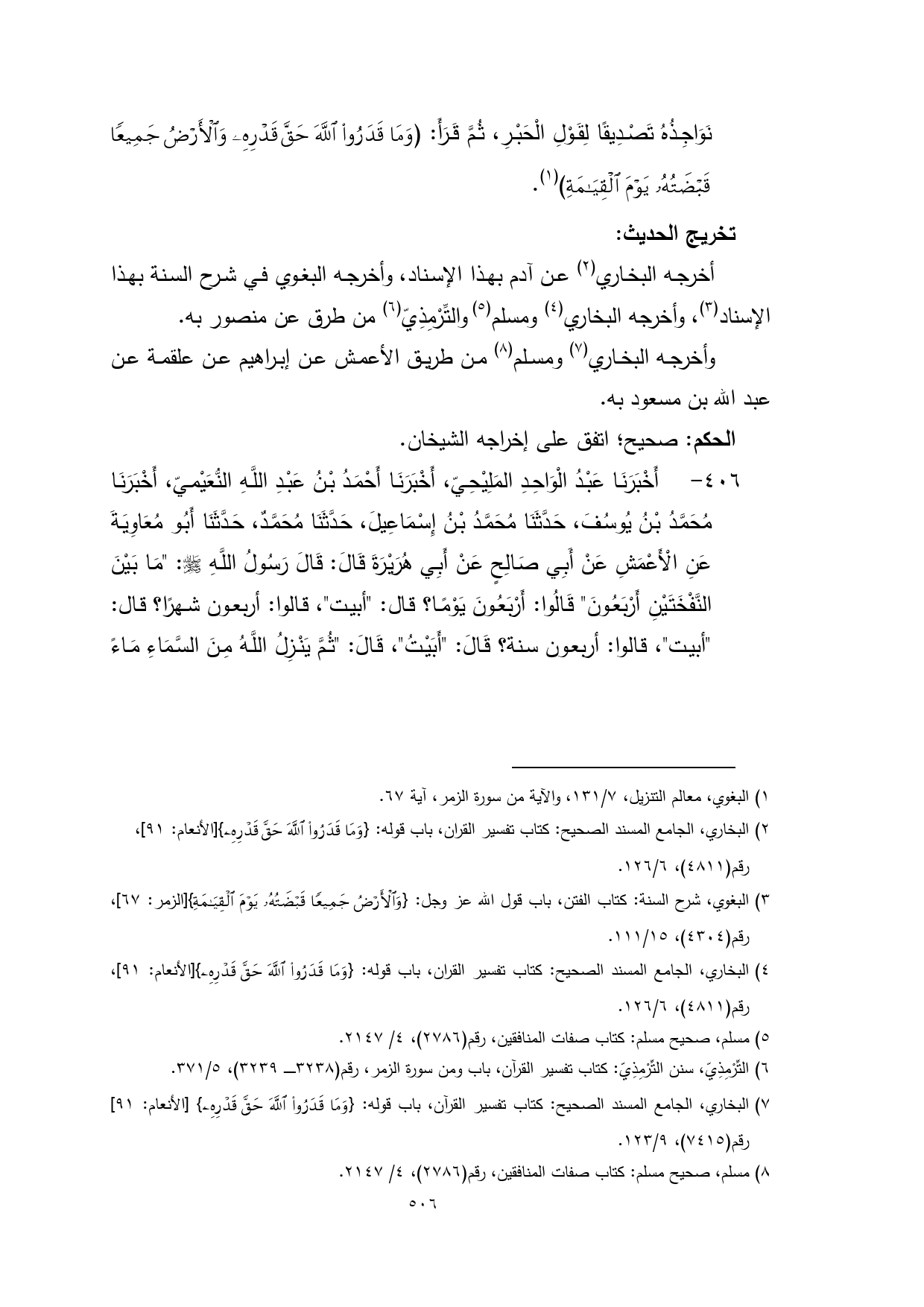 (¬3) البغوي، شرح السنة: كتاب الفتن، باب قول الله عز وجل: {وَالْأَرْضُ جَمِيعًا قَبْضَتُهُ يَوْمَ الْقِيَامَةِ} [الزمر: 67]، رقم (4304)، 15/ 111.