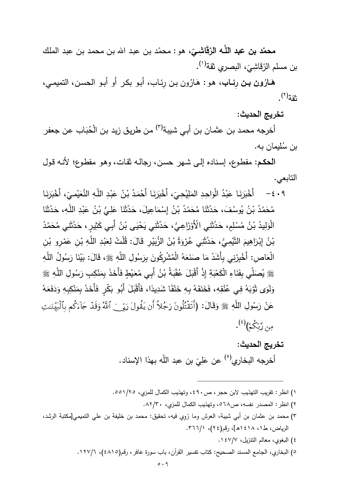 409 - أَخْبَرَنَا عَبْدُ الْوَاحِدِ المَلِيْحِيّ، أَخْبَرَنَا أَحْمَدُ بْنُ عَبْدِ اللَّهِ النُّعَيْميّ، أَخْبَرَنَا مُحَمَّدُ بْنُ يُوسُفَ، حَدَّثَنَا مُحَمَّدُ بْنُ إِسْمَاعِيلَ، حَدَّثَنَا عَلِيُّ بْنُ عَبْدِ اللَّهِ، حَدَّثَنَا الْوَلِيدُ بْنُ مُسْلِمٍ، حَدَّثَنِي الْأَوْزَاعِيُّ، حَدَّثَنِي يَحْيَى بْنُ أَبِي كَثِيرٍ، حَدَّثَنِي مُحَمَّدُ بْنُ إِبْرَاهِيمَ التَّيْمِيُّ، حَدَّثَنِي عُرْوَةُ بْنُ الزُّبَيْرِ قَالَ: قُلْتُ لِعَبْدِ اللَّهِ بْنِ عَمْرِو بْنِ الْعَاصِ: أَخْبِرْنِي بِأَشَدِّ مَا صَنَعَهُ الْمُشْرِكُونَ بِرَسُولِ اللَّهِ - صلى الله عليه وسلم -، قَالَ: بَيْنَا رَسُولُ اللَّهِ - صلى الله عليه وسلم - يُصَلِّي بِفَنَاءِ الْكَعْبَةِ إِذْ أَقْبَلَ عُقْبَةُ بْنُ أَبِي مُعَيْطٍ فَأَخَذَ بِمَنْكِبِ رَسُولِ اللَّهِ - صلى الله عليه وسلم - وَلَوَى ثَوْبَهُ فِي عُنُقِهِ، فَخَنَقَهُ بِهِ خَنْقًا شَدِيدًا، فَأَقْبَلَ أَبُو بَكْرٍ فَأَخَذَ بِمَنْكِبِهِ وَدَفَعَهُ عَنْ رَسُولِ اللَّهِ - صلى الله عليه وسلم - وَقَالَ: {أَتَقْتُلُونَ رَجُلًا أَنْ يَقُولَ رَبِّيَ اللَّهُ وَقَدْ جَاءَكُمْ بِالْبَيِّنَاتِ مِنْ رَبِّكُمْ} (¬4).