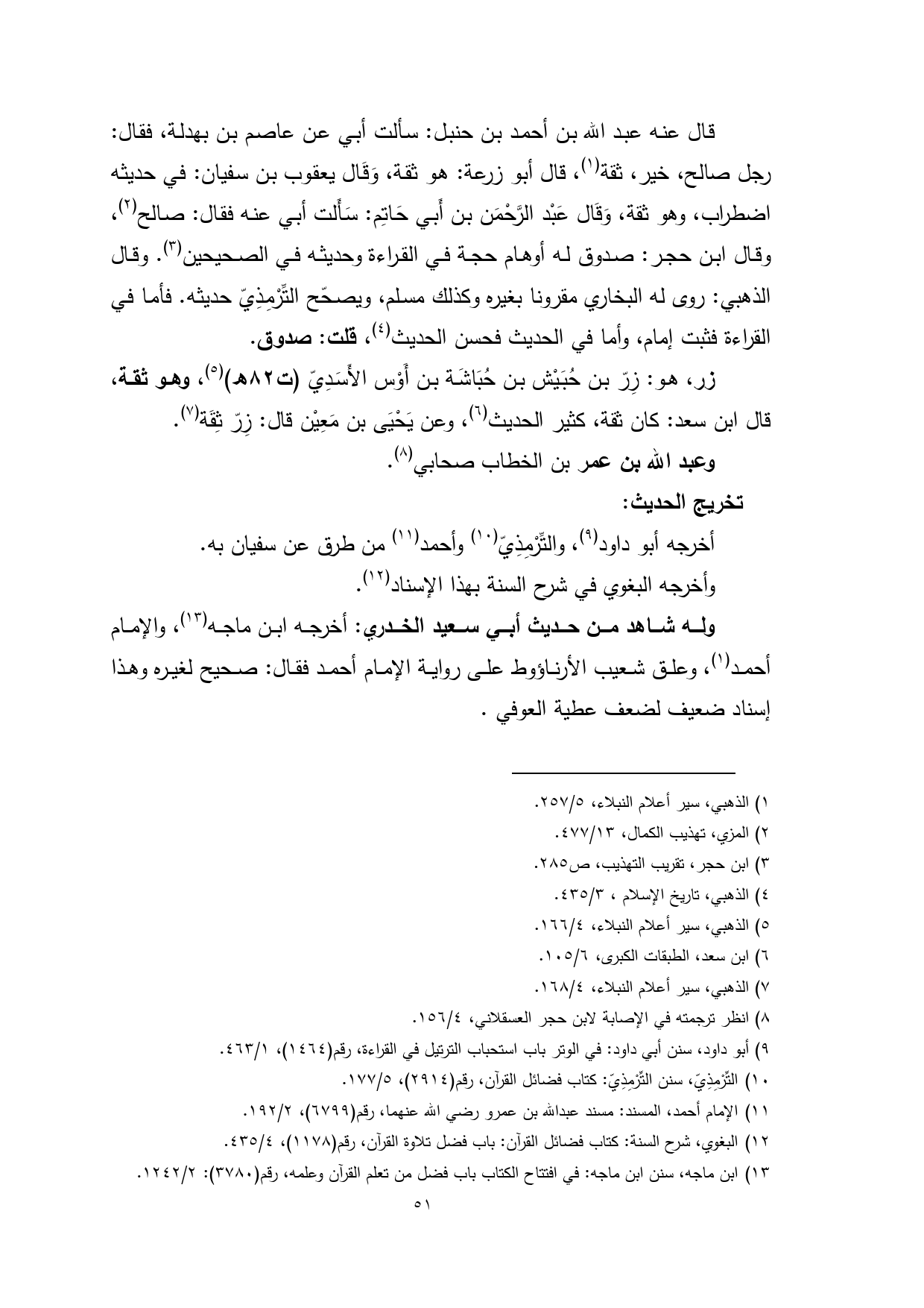 زر، هو: زِرّ بن حُبَيْش بن حُبَاشَة بن أَوْس الأَسَدِيّ (ت 82 هـ) (¬5)، وهو ثقة، قال ابن سعد: كان ثقة، كثير الحديث (¬6)، وعن يَحْيَى بن مَعِيْن قال: زِرّ ثِقَة (¬7).