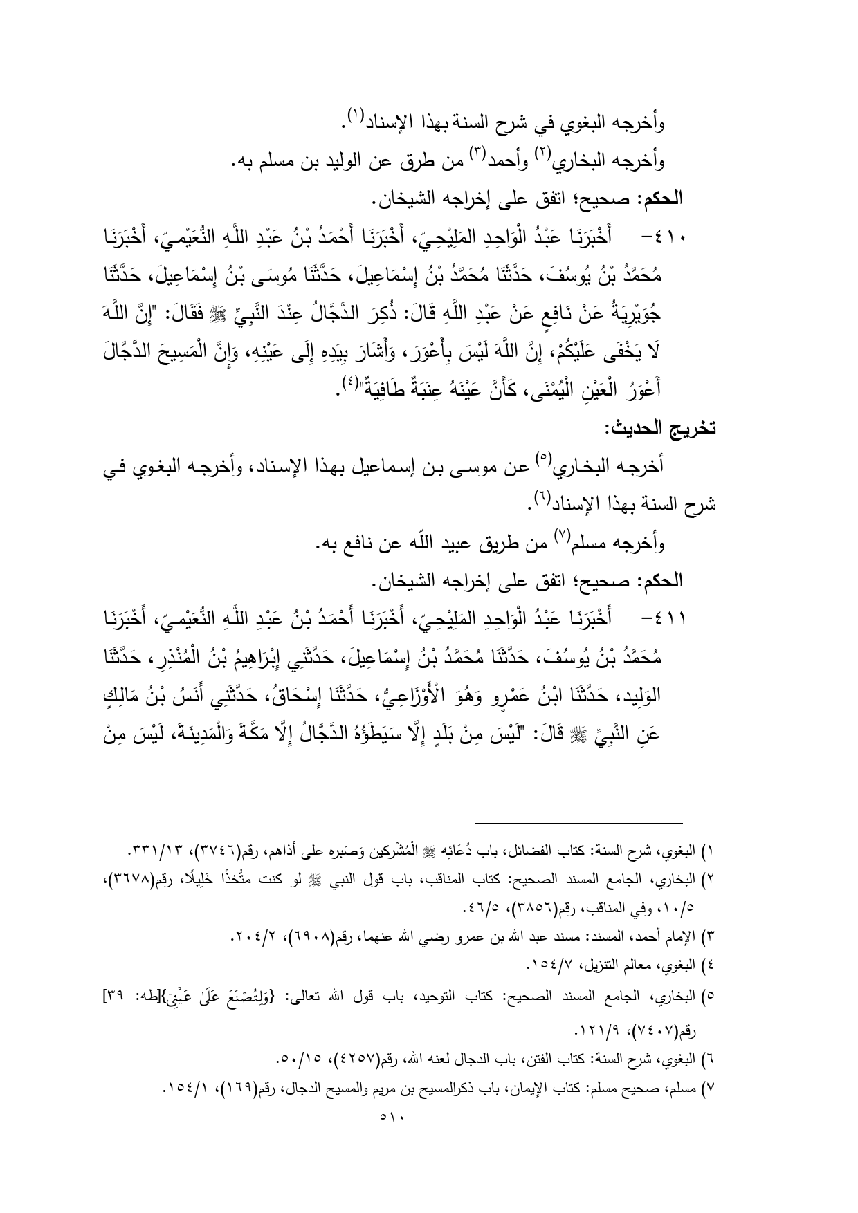 (¬6) البغوي، شرح السنة: كتاب الفتن، باب الدجال لعنه الله، رقم (4257)، 15/ 50.