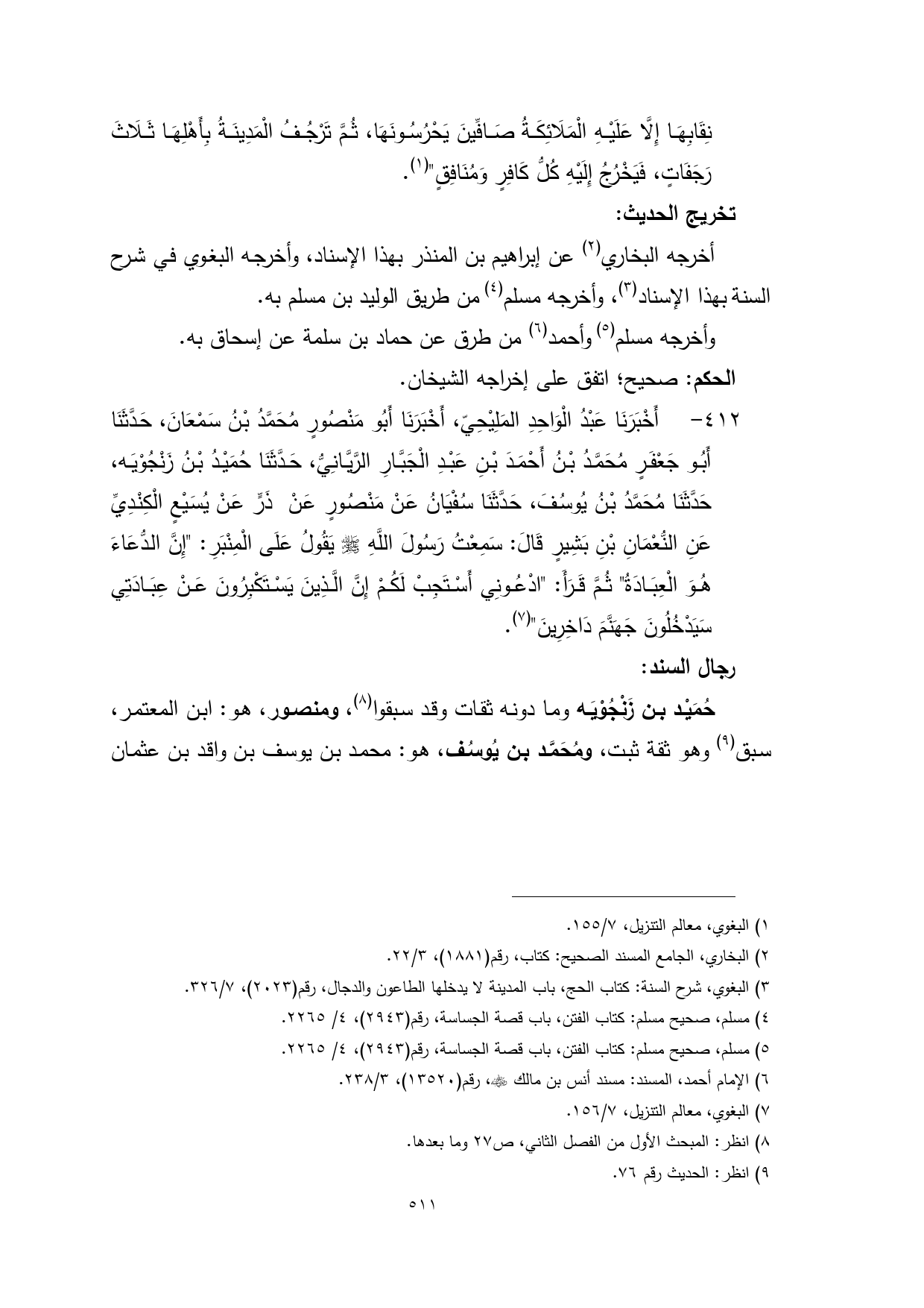 (¬3) البغوي، شرح السنة: كتاب الحج، باب المدينة لا يدخلها الطاعون والدجال، رقم (2023)، 7/ 326.
