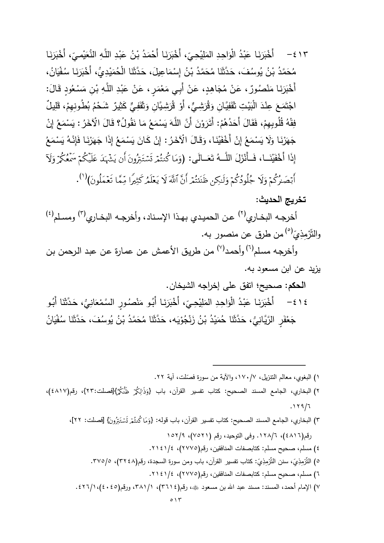 413 - أَخْبَرَنَا عَبْدُ الْوَاحِدِ المَلِيْحِيّ، أَخْبَرَنَا أَحْمَدُ بْنُ عَبْدِ اللَّهِ النُّعَيْميّ، أَخْبَرَنَا مُحَمَّدُ بْنُ يُوسُفَ، حَدَّثَنَا مُحَمَّدُ بْنُ إِسْمَاعِيلَ، حَدَّثَنَا الْحُمَيْدِيُّ، أَخْبَرَنَا سُفْيَانُ، أَخْبَرَنَا مَنْصُورٌ، عَنْ مُجَاهِدٍ، عَنْ أَبِي مَعْمَرٍ، عَنْ عَبْدِ اللَّهِ بْنِ مَسْعُودٍ قَالَ: اجْتَمَعَ عِنْدَ الْبَيْتِ ثَقَفِيَّانِ وَقُرَشِيٌّ، أَوْ قُرَشِيَّانِ وَثَقَفِيٌّ كَثِيرٌ شَحْمُ بُطُونِهِمْ، قَلِيلٌ فِقْهُ قُلُوبِهِمْ، فَقَالَ أَحَدُهُمْ: أَتَرَوْنَ أَنَّ اللَّهَ يَسْمَعُ مَا نَقُولُ؟ قَالَ الْآخَرُ: يَسْمَعُ إِنْ جَهَرْنَا وَلَا يَسْمَعُ إِنْ أَخْفَيْنَا، وَقَالَ الْآخَرُ: إِنْ كَانَ يَسْمَعُ إِذَا جَهَرْنَا فَإِنَّهُ يَسْمَعُ إِذَا أَخْفَيْنَا، فَأَنْزَلَ اللَّهُ تَعَالَى: وَمَا كُنْتُمْ تَسْتَتِرُونَ أَنْ يَشْهَدَ عَلَيْكُمْ سَمْعُكُمْ وَلَا أَبْصَارُكُمْ وَلَا جُلُودُكُمْ وَلَكِنْ ظَنَنْتُمْ أَنَّ اللَّهَ لَا يَعْلَمُ كَثِيرًا مِمَّا تَعْمَلُونَ) (¬1).
