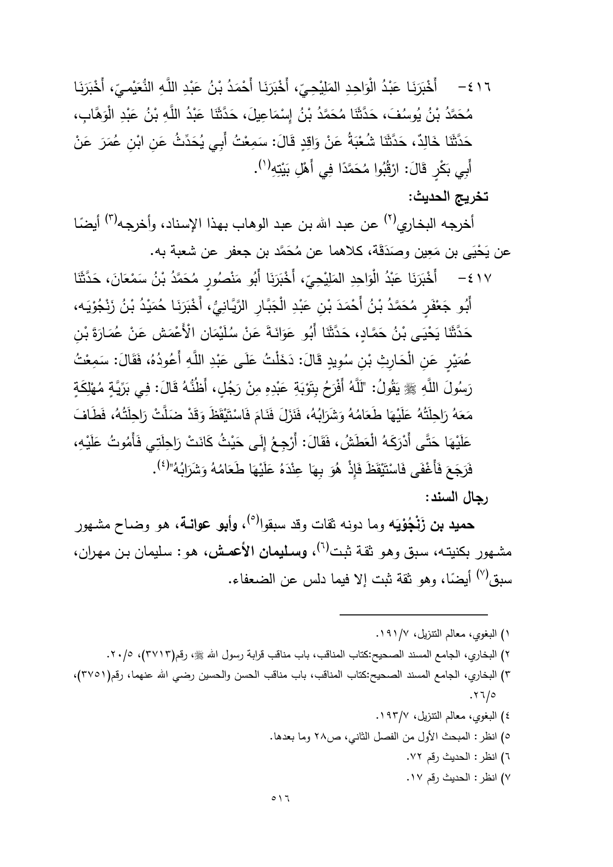 416 - أَخْبَرَنَا عَبْدُ الْوَاحِدِ المَلِيْحِيّ، أَخْبَرَنَا أَحْمَدُ بْنُ عَبْدِ اللَّهِ النُّعَيْميّ، أَخْبَرَنَا مُحَمَّدُ بْنُ يُوسُفَ، حَدَّثَنَا مُحَمَّدُ بْنُ إِسْمَاعِيلَ، حَدَّثَنَا عَبْدُ اللَّهِ بْنُ عَبْدِ الْوَهَّابِ، حَدَّثَنَا خَالِدٌ، حَدَّثَنَا شُعْبَةُ عَنْ وَاقِدٍ قَالَ: سَمِعْتُ أَبِي يُحَدِّثُ عَنِ ابْنِ عُمَرَ عَنْ أَبِي بَكْرٍ قَالَ: ارْقُبُوا مُحَمَّدًا فِي أَهْلِ بَيْتِهِ (¬1).