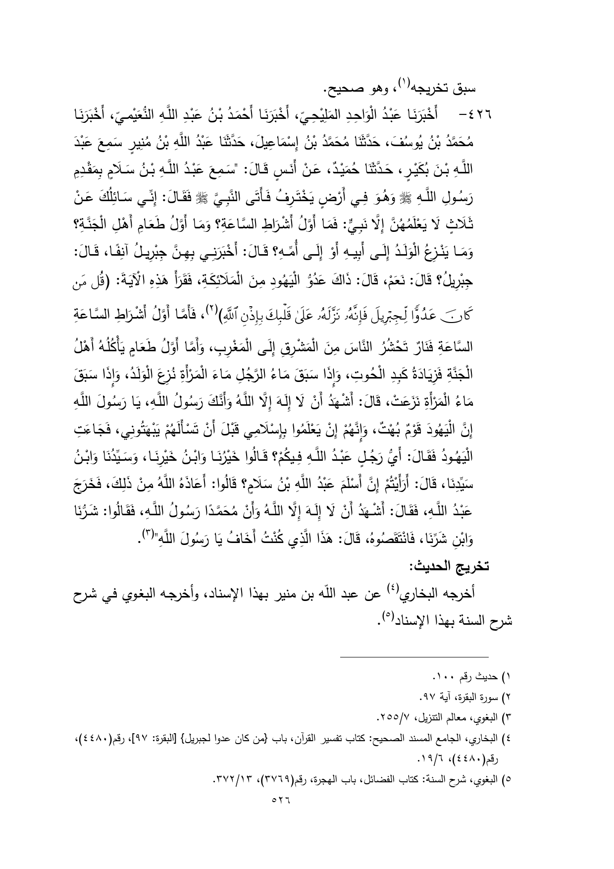 426 - أَخْبَرَنَا عَبْدُ الْوَاحِدِ المَلِيْحِيّ، أَخْبَرَنَا أَحْمَدُ بْنُ عَبْدِ اللَّهِ النُّعَيْميّ، أَخْبَرَنَا مُحَمَّدُ بْنُ يُوسُفَ، حَدَّثَنَا مُحَمَّدُ بْنُ إِسْمَاعِيلَ، حَدَّثَنَا عَبْدُ اللَّهِ بْنُ مُنِيرٍ سَمِعَ عَبْدَ اللَّهِ بْنَ بُكَيْرٍ، حَدَّثَنَا حُمَيْدٌ، عَنْ أَنَسٍ قَالَ: "سَمِعَ عَبْدُ اللَّهِ بْنُ سَلَامٍ بِمَقْدِمِ رَسُولِ اللَّهِ - صلى الله عليه وسلم - وَهُوَ فِي أَرْضٍ يَخْتَرِفُ فَأَتَى النَّبِيَّ - صلى الله عليه وسلم - فَقَالَ: إِنِّي سَائِلُكَ عَنْ ثَلَاثٍ لَا يَعْلَمُهُنَّ إِلَّا نَبِيٌّ: فَمَا أَوَّلُ أَشْرَاطِ السَّاعَةِ؟ وَمَا أَوَّلُ طَعَامِ أَهْلِ الْجَنَّةِ؟ وَمَا يَنْزِعُ الْوَلَدُ إِلَى أَبِيهِ أَوْ إِلَى أُمِّهِ؟ قَالَ: أَخْبَرَنِي بِهِنَّ جِبْرِيلُ آنِفًا، قَالَ: جِبْرِيلُ؟ قَالَ: نَعَمْ، قَالَ: ذَاكَ عَدُوُّ الْيَهُودِ مِنَ الْمَلَائِكَةِ، فَقَرَأَ هَذِهِ الْآيَةَ: {قُلْ مَنْ كَانَ عَدُوًّا لِجِبْرِيلَ فَإِنَّهُ نَزَّلَهُ عَلَى قَلْبِكَ بِإِذْنِ اللَّهِ} (¬2)، فَأَمَّا أَوَّلُ أَشْرَاطِ السَّاعَةِ فَنَارٌ تَحْشُرُ النَّاسَ مِنَ الْمَشْرِقِ إِلَى الْمَغْرِبِ، وَأَمَّا أَوَّلُ طَعَامٍ يَأْكُلُهُ أَهْلُ الْجَنَّةِ فَزِيَادَةُ كَبِدِ الْحُوتِ، وَإِذَا سَبَقَ مَاءُ الرَّجُلِ مَاءَ الْمَرْأَةِ نُزِعَ الْوَلَدُ، وَإِذَا سَبَقَ مَاءُ الْمَرْأَةِ نَزَعَتْ، قَالَ: أَشْهَدُ أَنْ لَا إِلَهَ إِلَّا اللَّهُ وَأَنَّكَ رَسُولُ اللَّهِ، يَا رَسُولَ اللَّهِ إِنَّ الْيَهُودَ قَوْمٌ بُهْتٌ، وَإِنَّهُمْ إِنْ يَعْلَمُوا بِإِسْلَامِي قَبْلَ أَنْ تَسْأَلَهُمْ يَبْهَتُونِي، فَجَاءَتِ الْيَهُودُ فَقَالَ: أَيُّ رَجُلٍ عَبْدُ اللَّهِ فِيكُمْ؟ قَالُوا خَيْرُنَا وَابْنُ خَيْرِنَا، وَسَيِّدُنَا وَابْنُ سَيِّدِنَا، قَالَ: أَرَأَيْتُمْ إِنَّ أَسْلَمَ عَبْدُ اللَّهِ بْنُ سَلَامٍ؟ قَالُوا: أَعَاذَهُ اللَّهُ مِنْ ذَلِكَ، فَخَرَجَ عَبْدُ اللَّهِ، فَقَالَ: أَشْهَدُ أَنْ لَا إِلَهَ إِلَّا اللَّهُ وَأَنْ مُحَمَّدًا رَسُولُ اللَّهِ، فَقَالُوا: شَرُّنَا وَابْنِ شَرِّنَا، فَانْتَقَصُوهُ، قَالَ: هَذَا الَّذِي كُنْتُ أَخَافُ يَا رَسُولَ اللَّهِ" (¬3).