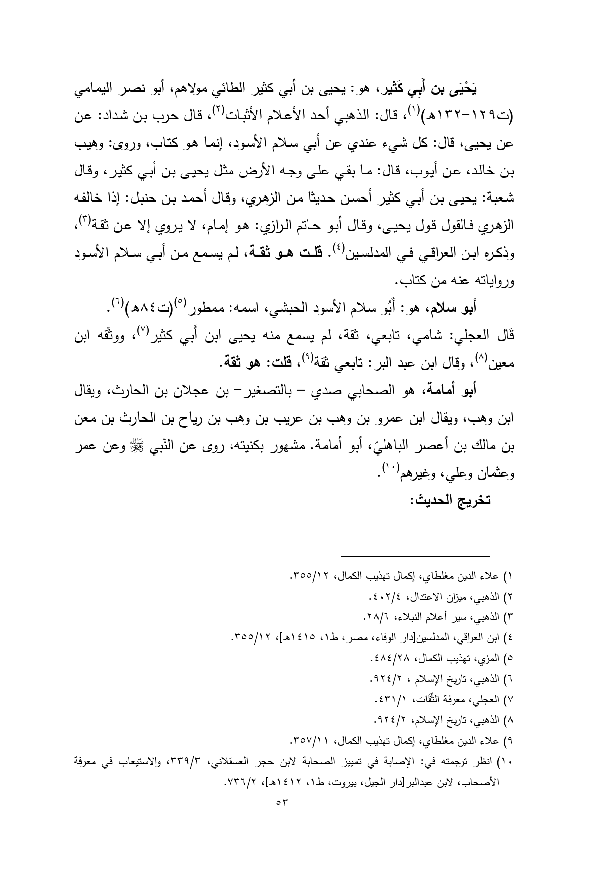 يَحْيَى بن أَبِي كَثير، هو: يحيى بن أبي كثير الطائي مولاهم، أبو نصر اليمامي (ت 129 - 132 هـ) (¬1)، قال: الذهبي أحد الأعلام الأثبات (¬2)، قال حرب بن شداد: عن يحيى، قال: كل شيء عندي عن أبي سلام الأسود، إنما هو كتاب، وروى: وهيب بن خالد، عن أيوب، قال: ما بقي على وجه الأرض مثل يحيى بن أبي كثير، وقال شعبة: يحيى بن أبي كثير أحسن حديثا من الزهري، وقال أحمد بن حنبل: إذا خالفه الزهري فالقول قول يحيى، وقال أبو حاتم الرازي: هو إمام، لا يروي إلا عن ثقة (¬3)، وذكره ابن العراقي في المدلسين (¬4). قلت هو ثقة، لم يسمع من أبي سلام الأسود ورواياته عنه من كتاب.