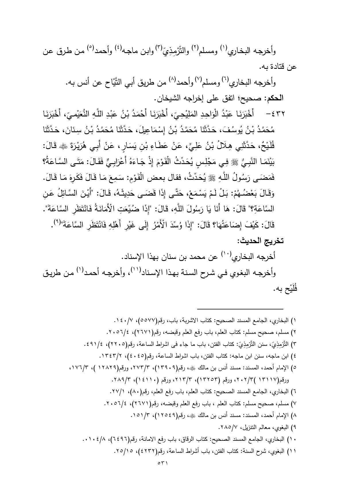 432 - أَخْبَرَنَا عَبْدُ الْوَاحِدِ المَلِيْحِيّ، أَخْبَرَنَا أَحْمَدُ بْنُ عَبْدِ اللَّهِ النُّعَيْميّ، أَخْبَرَنَا مُحَمَّدُ بْنُ يُوسُفَ، حَدَّثَنَا مُحَمَّدُ بْنُ إِسْمَاعِيلَ، حَدَّثَنَا مُحَمَّدُ بْنُ سِنَانَ، حَدَّثَنَا فُلَيْحٌ، حَدَّثَنِي هِلَالُ بْنُ عَلِيٍّ، عَنْ عَطَاءِ بْنِ يَسَارٍ، عَنْ أَبِي هُرَيْرَةَ - رضي الله عنه - قَالَ: بَيْنَمَا النَّبِيُّ - صلى الله عليه وسلم - فِي مَجْلِسٍ يُحَدِّثُ الْقَوْمَ إِذْ جَاءَهُ أَعْرَابِيٌّ فَقَالَ: مَتَى السَّاعَةُ؟ فَمَضَى رَسُولُ اللَّهِ - صلى الله عليه وسلم - يُحَدِّثُ، فقال بعض الْقَوْمِ: سَمِعَ مَا قَالَ فَكَرِهَ مَا قَالَ. وَقَالَ بَعْضُهُمْ: بَلْ لَمْ يَسْمَعْ، حَتَّى إِذَا قَضَى حَدِيثَهُ، قَالَ: "أَيْنَ السَّائِلُ عَنِ السَّاعَةِ؟ " قَالَ: هَا أَنَا يَا رَسُولَ اللَّهِ، قَالَ: "إِذَا ضُيِّعَتِ الْأَمَانَةُ فَانْتَظَرِ السَّاعَةَ". قَالَ: كَيْفَ إِضَاعَتُهَا؟ قَالَ: "إِذَا وُسِّدَ الْأَمْرُ إِلَى غَيْرِ أَهْلِهِ فَانْتَظَرِ السَّاعَةَ" (¬9).