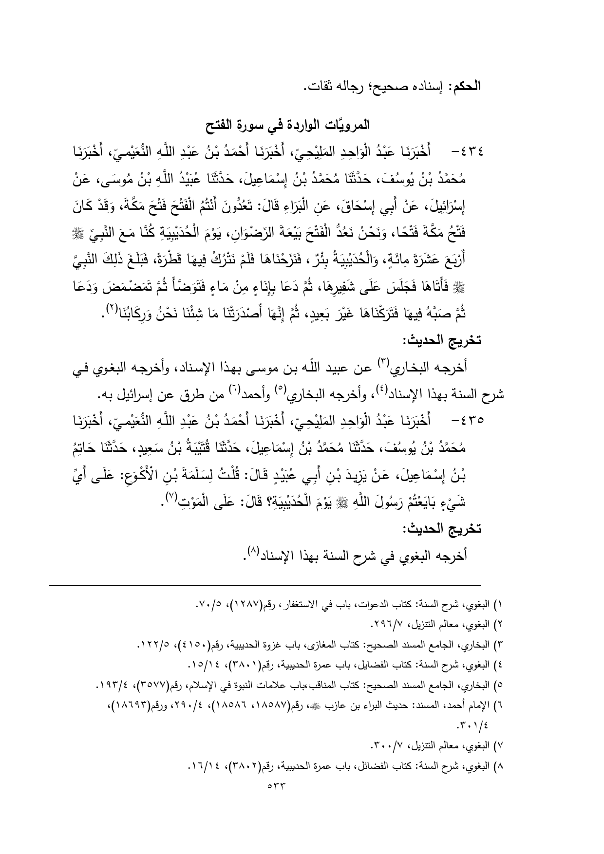 (¬3) البغوي، شرح السنة: كتاب الفضايل، باب عمرة الحديبية، رقم (3801)، 14/ 15.