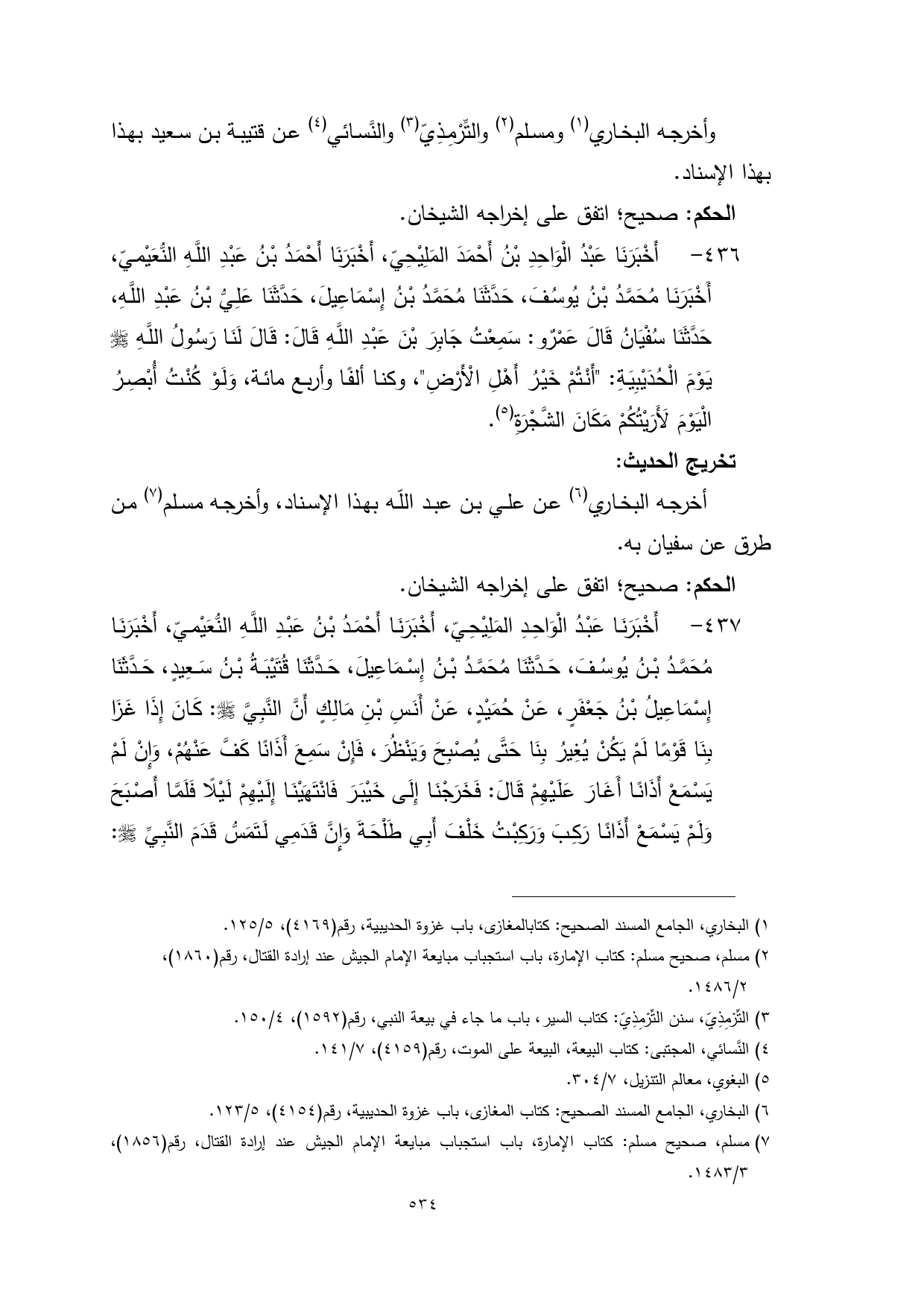 (¬7) مسلم، صحيح مسلم: كتاب الإمارة، باب استجباب مبايعة الإمام الجيش عند إرادة القتال، رقم (1856)، 3/ 1483.