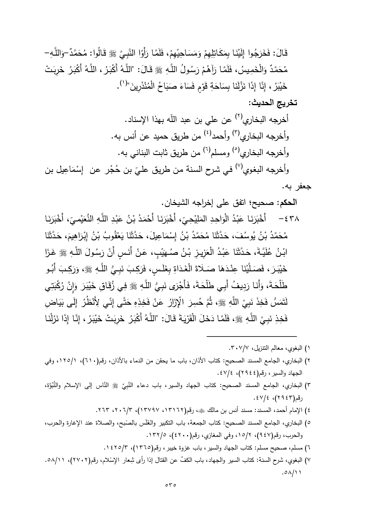 (¬5) البخاري، الجامع المسند الصحيح: كتاب الجمعة، باب التكبير والغَلَس بالصّبح، والصلاة عند الإغارة والحرب، رقم (947)، 2/ 15، وفي المغازي، رقم (4200)، 5/ 132.