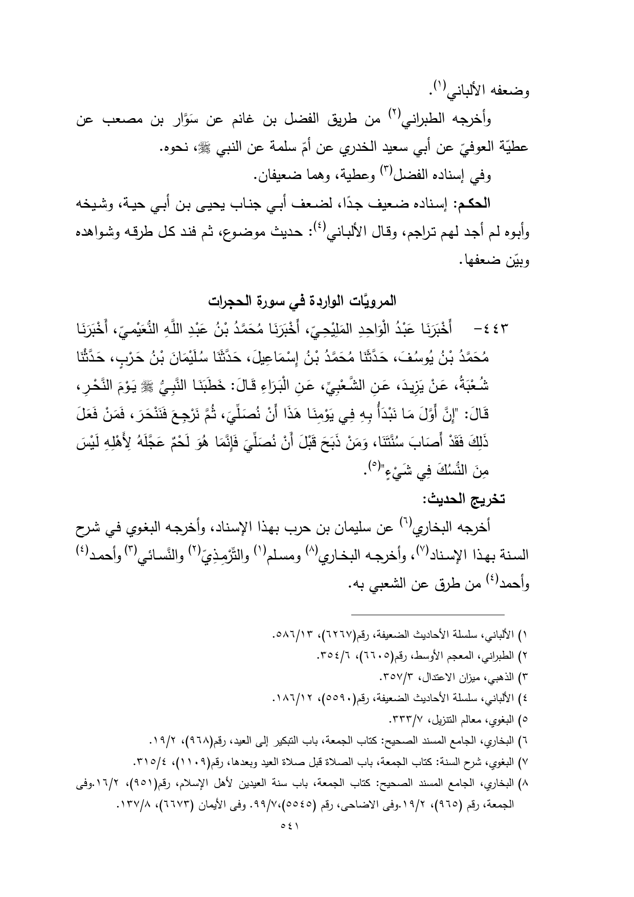 443 - أَخْبَرَنَا عَبْدُ الْوَاحِدِ المَلِيْحِيّ، أَخْبَرَنَا مُحَمَّدُ بْنُ عَبْدِ اللَّهِ النُّعَيْميّ، أَخْبَرَنَا مُحَمَّدُ بْنُ يُوسُفَ، حَدَّثَنَا مُحَمَّدُ بْنُ إِسْمَاعِيلَ، حَدَّثَنَا سُلَيْمَانَ بْنُ حَرْبٍ، حَدَّثْنَا شُعْبَةُ، عَنْ يَزِيدَ، عَنِ الشَّعْبِيِّ، عَنِ الْبَرَاءِ قَالَ: خَطَبَنَا النَّبِيُّ - صلى الله عليه وسلم - يَوْمَ النَّحْرِ، قَالَ: "إِنَّ أَوَّلَ مَا نَبْدَأُ بِهِ فِي يَوْمِنَا هَذَا أَنْ نُصَلِّيَ، ثُمَّ نَرْجِعَ فَنَنْحَرَ، فَمَنْ فَعَلَ ذَلِكَ فَقَدْ أَصَابَ سُنَّتَنَا، وَمَنْ ذَبَحَ قَبْلَ أَنْ نُصَلِّيَ فَإِنَّمَا هُوَ لَحْمٌ عَجَّلَهُ لِأَهْلِهِ لَيْسَ مِنَ النُّسُكَ فِي شَيْءٍ" (¬5).