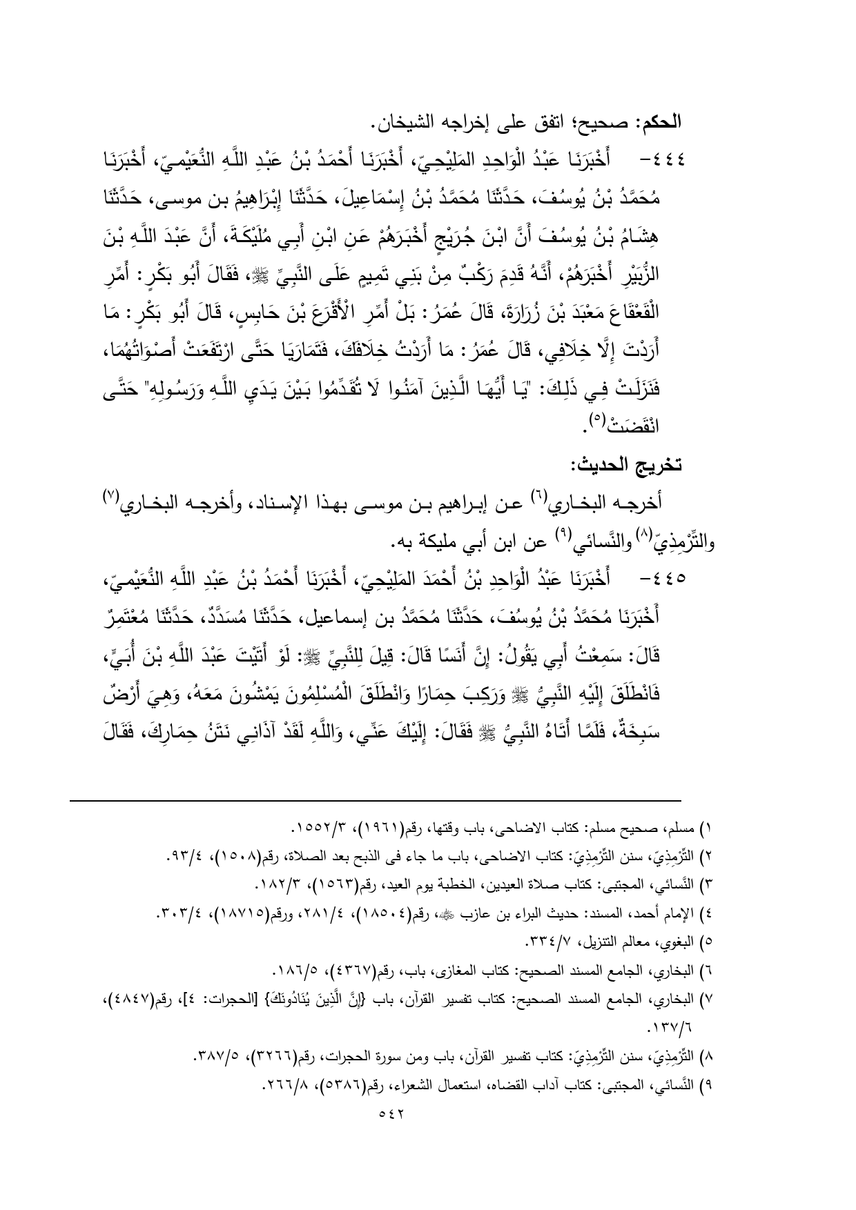444 - أَخْبَرَنَا عَبْدُ الْوَاحِدِ المَلِيْحِيّ، أَخْبَرَنَا أَحْمَدُ بْنُ عَبْدِ اللَّهِ النُّعَيْميّ، أَخْبَرَنَا مُحَمَّدُ بْنُ يُوسُفَ، حَدَّثَنَا مُحَمَّدُ بْنُ إِسْمَاعِيلَ، حَدَّثَنَا إِبْرَاهِيمُ بن موسى، حَدَّثَنَا هِشَامُ بْنُ يُوسُفَ أَنَّ ابْنَ جُرَيْجٍ أَخْبَرَهُمْ عَنِ ابْنِ أَبِي مُلَيْكَةَ، أَنَّ عَبْدَ اللَّهِ بْنَ الزُّبَيْرِ أَخْبَرَهُمْ، أَنَّهُ قَدِمَ رَكْبٌ مِنْ بَنِي تَمِيمٍ عَلَى النَّبِيِّ - صلى الله عليه وسلم -، فَقَالَ أَبُو بَكْرٍ: أَمِّرِ الْقَعْقَاعَ مَعْبَدَ بْنَ زُرَارَةَ، قَالَ عُمَرُ: بَلْ أَمِّرِ الْأَقْرَعَ بْنَ حَابِسٍ، قَالَ أَبُو بَكْرٍ: مَا أَرَدْتَ إِلَّا خِلَافِي، قَالَ عُمَرُ: مَا أَرَدْتُ خِلَافَكَ، فَتَمَارَيَا حَتَّى ارْتَفَعَتْ أَصْوَاتُهُمَا، فَنَزَلَتْ فِي ذَلِكَ: "يَا أَيُّهَا الَّذِينَ آمَنُوا لَا تُقَدِّمُوا بَيْنَ يَدَيِ اللَّهِ وَرَسُولِهِ" حَتَّى انْقَضَتْ (¬1).