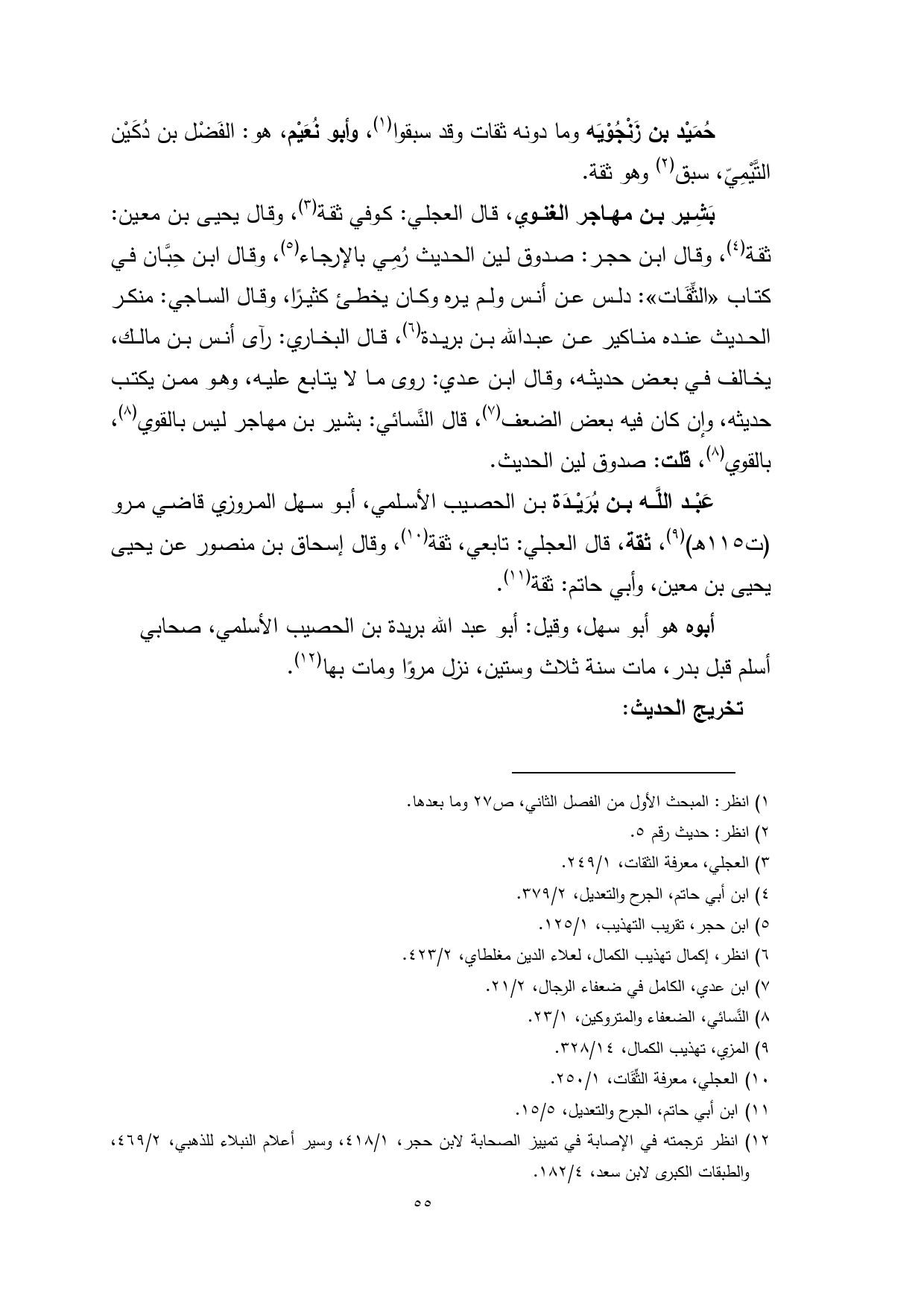عَبْد اللَّه بن بُرَيْدَة بن الحصيب الأسلمي، أبو سهل المروزي قاضي مرو (ت 115 هـ) (¬9)، ثقة، قال العجلي: تابعي، ثقة (¬10)، وقال إسحاق بن منصور عن يحيى بن معين، وأبي حاتم: ثقة (¬11).