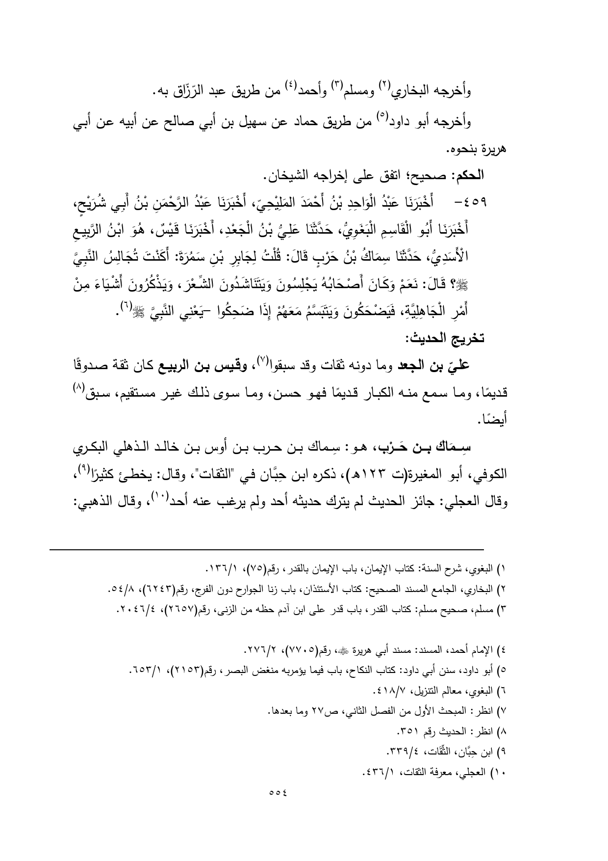459 - أَخْبَرَنَا عَبْدُ الْوَاحِدِ بْنُ أَحْمَدَ المَلِيْحِيّ، أَخْبَرَنَا عَبْدُ الرَّحْمَنِ بْنُ أَبِي شُرَيْحٍ، أَخْبَرَنَا أَبُو الْقَاسِمِ الْبَغَوِيُّ، حَدَّثَنَا عَلِيُّ بْنُ الْجَعْدِ، أَخْبَرَنَا قَيْسٌ، هُوَ ابْنُ الرَّبِيعِ الْأَسَدِيُّ، حَدَّثَنَا سِمَاكُ بْنُ حَرْبٍ قَالَ: قُلْتُ لِجَابِرِ بْنِ سَمُرَةَ: أَكَنْتَ تُجَالِسُ النَّبِيَّ - صلى الله عليه وسلم -؟ قَالَ: نَعَمْ وَكَانَ أَصْحَابُهُ يَجْلِسُونَ وَيَتَنَاشَدُونَ الشِّعْرَ، وَيَذْكُرُونَ أَشْيَاءَ مِنْ أَمْرِ الْجَاهِلِيَّةِ، فَيَضْحَكُونَ وَيَتَبَسَّمُ مَعَهُمْ إِذَا ضَحِكُوا -يَعْنِي النَّبِيَّ - صلى الله عليه وسلم - (¬5).