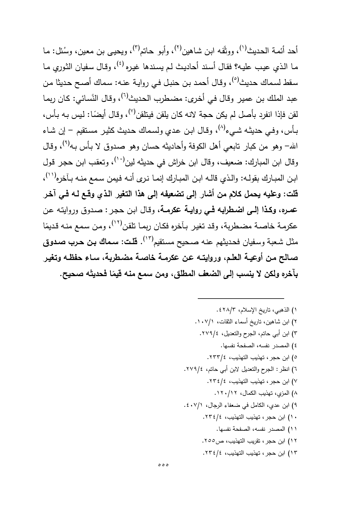 أحد أئمة الحديث (¬1)، ووثّقه ابن شاهين (¬2)، وأبو حاتم (¬3)، ويحيى بن معين، وسُئل: ما الذي عيب عليه؟ فقال أسند أحاديث لم يسندها غيره (¬4)، وقال سفيان الثوري ما سقط لسماك حديث (¬5)، وقال أحمد بن حنبل في رواية عنه: سماك أصح حديثا من عبد الملك بن عمير وقال في أخرى: مضطرب الحديث (¬6)، وقال النَّسائي: كان ربما لقن فإذا انفرد بأصل لم يكن حجة لانه كان يلقن فيتلقن (¬7)، وقال أيضًا: ليس به بأس، وفي حديثه شيء (¬8)، وقال ابن عدي ولسماك حديث كثير مستقيم - إن شاء الله- وهو من كبار تابعي أهل الكوفة وأحاديثه حسان وهو صدوق لا بأس به (¬9)، وقال ابن المبارك: ضعيف، وقال ابن خراش في حديثه لين (¬10)، وتعقب ابن حجر قول ابن المبارك بقوله: والذي قاله ابن المبارك إنما نرى أنه فيمن سمع منه بآخره (¬11)، قلت: وعليه يحمل كلام من أشار إلى تضعيفه إلى هذا التغير الذي وقع له في آخر عمره، وكذا إلى اضطرابه في رواية عكرمة، وقال ابن حجر: صدوق وروايته عن عكرمة خاصة مضطربة، وقد تغير بآخره فكان ربما تلقن (¬12)، ومن سمع منه قديمًا مثل شعبة وسفيان فحديثهم عنه صحيح مستقيم (¬13). قلت: سماك بن حرب صدوق صالح من أوعية العلم، وروايته عن عكرمة خاصة مضطربة، ساء حفظه وتغير بآخره ولكن لا ينسب إلى الضعف المطلق، ومن سمع منه قيمًا فحديثه صحيح.
