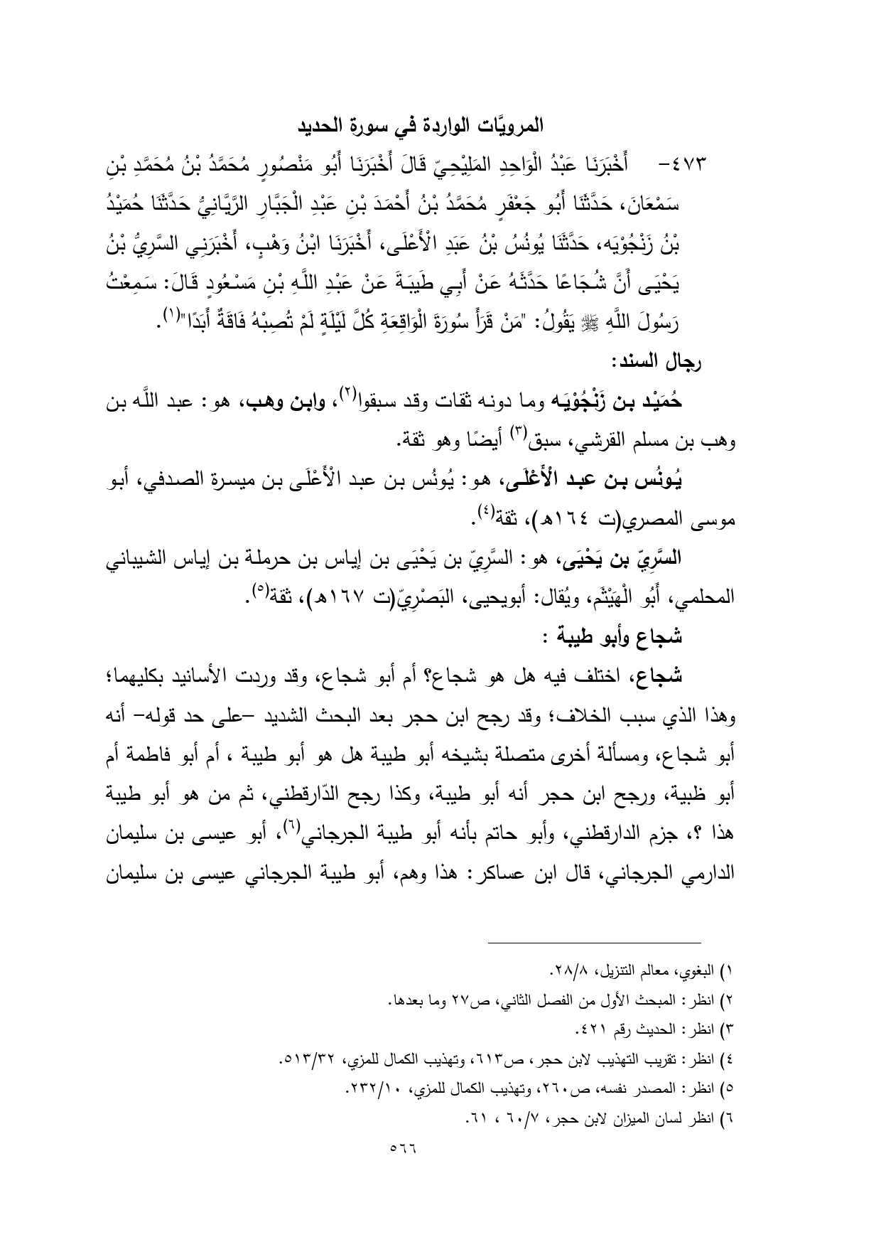 473 - أَخْبَرَنَا عَبْدُ الْوَاحِدِ المَلِيْحِيّ قَالَ أَخْبَرَنَا أَبُو مَنْصُورٍ مُحَمَّدُ بْنُ مُحَمَّدِ بْنِ سَمْعَانَ، حَدَّثَنَا أَبُو جَعْفَرٍ مُحَمَّدُ بْنُ أَحْمَدَ بْنِ عَبْدِ الْجَبَّارِ الرَّيَّانِيُّ حَدَّثَنَا حُمَيْدُ بْنُ زَنْجُوْيَه، حَدَّثَنَا يُونُسُ بْنُ عَبَدِ الْأَعْلَى، أَخْبَرَنَا ابْنُ وَهْبٍ، أَخْبَرَنِي السَّرِيُّ بْنُ يَحْيَى أَنَّ شُجَاعًا حَدَّثَهُ عَنْ أَبِي طَيبَةَ عَنْ عَبْدِ اللَّهِ بْنِ مَسْعُودٍ قَالَ: سَمِعْتُ رَسُولَ اللَّهِ - صلى الله عليه وسلم - يَقُولُ: "مَنْ قَرَأَ سُورَةَ الْوَاقِعَةِ كُلَّ لَيْلَةٍ لَمْ تُصِبْهُ فَاقَةٌ أَبَدًا" (¬1).