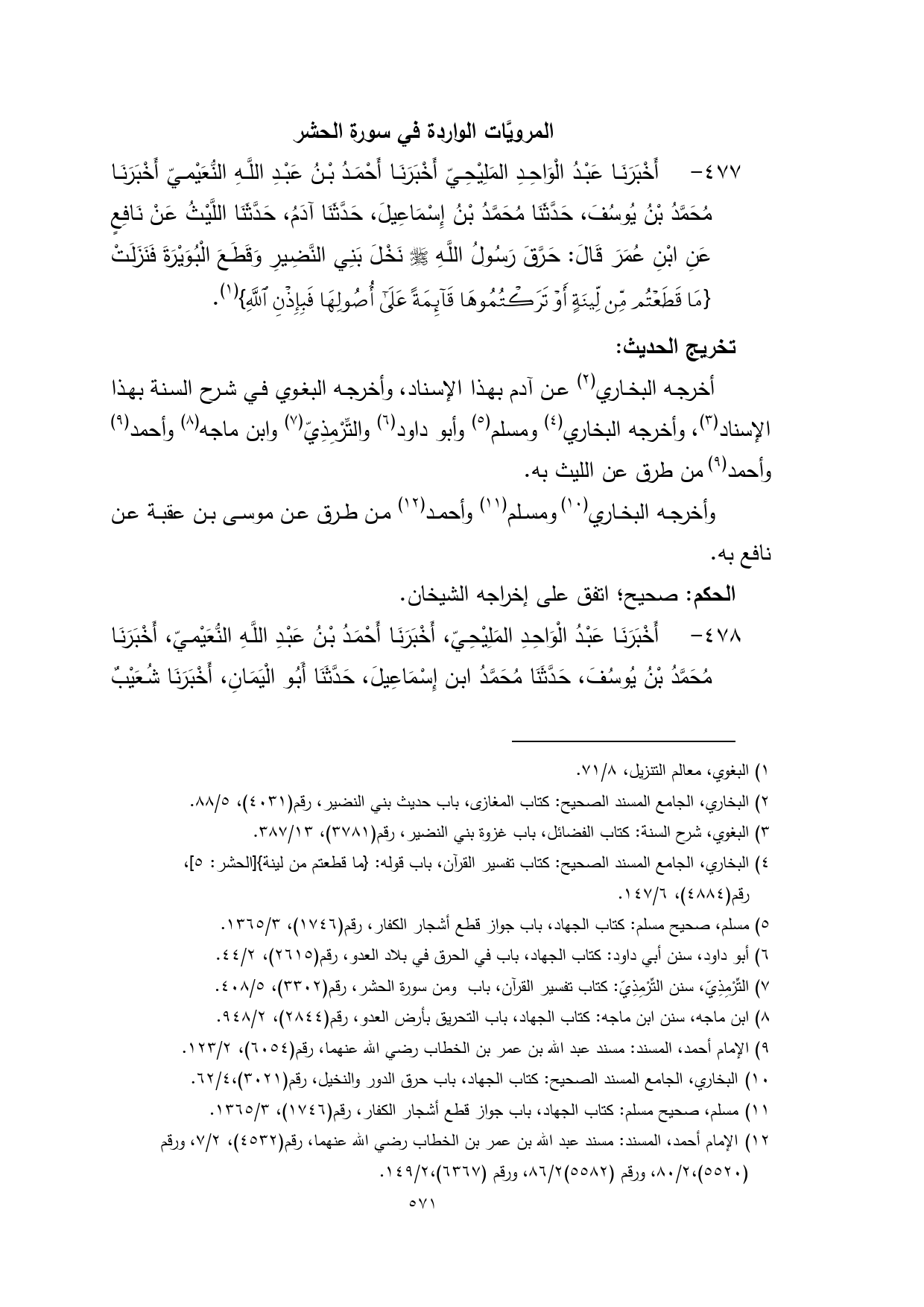 477 - أَخْبَرَنَا عَبْدُ الْوَاحِدِ المَلِيْحِيّ أَخْبَرَنَا أَحْمَدُ بْنُ عَبْدِ اللَّهِ النُّعَيْميّ أَخْبَرَنَا مُحَمَّدُ بْنُ يُوسُفَ، حَدَّثَنَا مُحَمَّدُ بْنُ إِسْمَاعِيلَ، حَدَّثَنَا آدَمُ، حَدَّثَنَا اللَّيْثُ عَنْ نَافِعٍ عَنِ ابْنِ عُمَرَ قَالَ: حَرَّقَ رَسُولُ اللَّهِ - صلى الله عليه وسلم - نَخْلَ بَنِي النَّضِيرِ وَقَطَعَ الْبُوَيْرَةَ فَنَزَلَتْ {مَا قَطَعْتُمْ مِنْ لِينَةٍ أَوْ تَرَكْتُمُوهَا قَائِمَةً عَلَى أُصُولِهَا فَبِإِذْنِ اللَّهِ} (¬1).