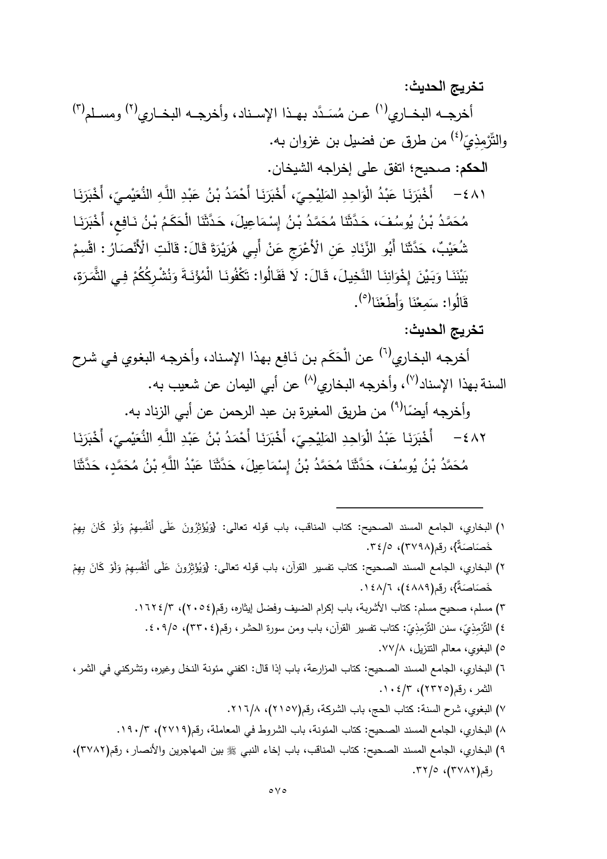 481 - أَخْبَرَنَا عَبْدُ الْوَاحِدِ المَلِيْحِيّ، أَخْبَرَنَا أَحْمَدُ بْنُ عَبْدِ اللَّهِ النُّعَيْميّ، أَخْبَرَنَا مُحَمَّدُ بْنُ يُوسُفَ، حَدَّثَنَا مُحَمَّدُ بْنُ إِسْمَاعِيلَ، حَدَّثَنَا الْحَكَمُ بْنُ نَافِعٍ، أَخْبَرَنَا شُعَيْبٌ، حَدَّثَنَا أَبُو الزِّنَادِ عَنِ الْأَعْرَجِ عَنْ أَبِي هُرَيْرَةَ قَالَ: قَالَتِ الْأَنْصَارُ: اقْسِمْ بَيْنَنَا وَبَيْنَ إِخْوَانِنَا النَّخِيلَ، قَالَ: لَا فَقَالُوا: تَكْفُونَا الْمُؤْنَةَ وَنُشْرِكُكُمْ فِي الثَّمَرَةِ، قَالُوا: سَمِعْنَا وَأَطَعْنَا (¬5).