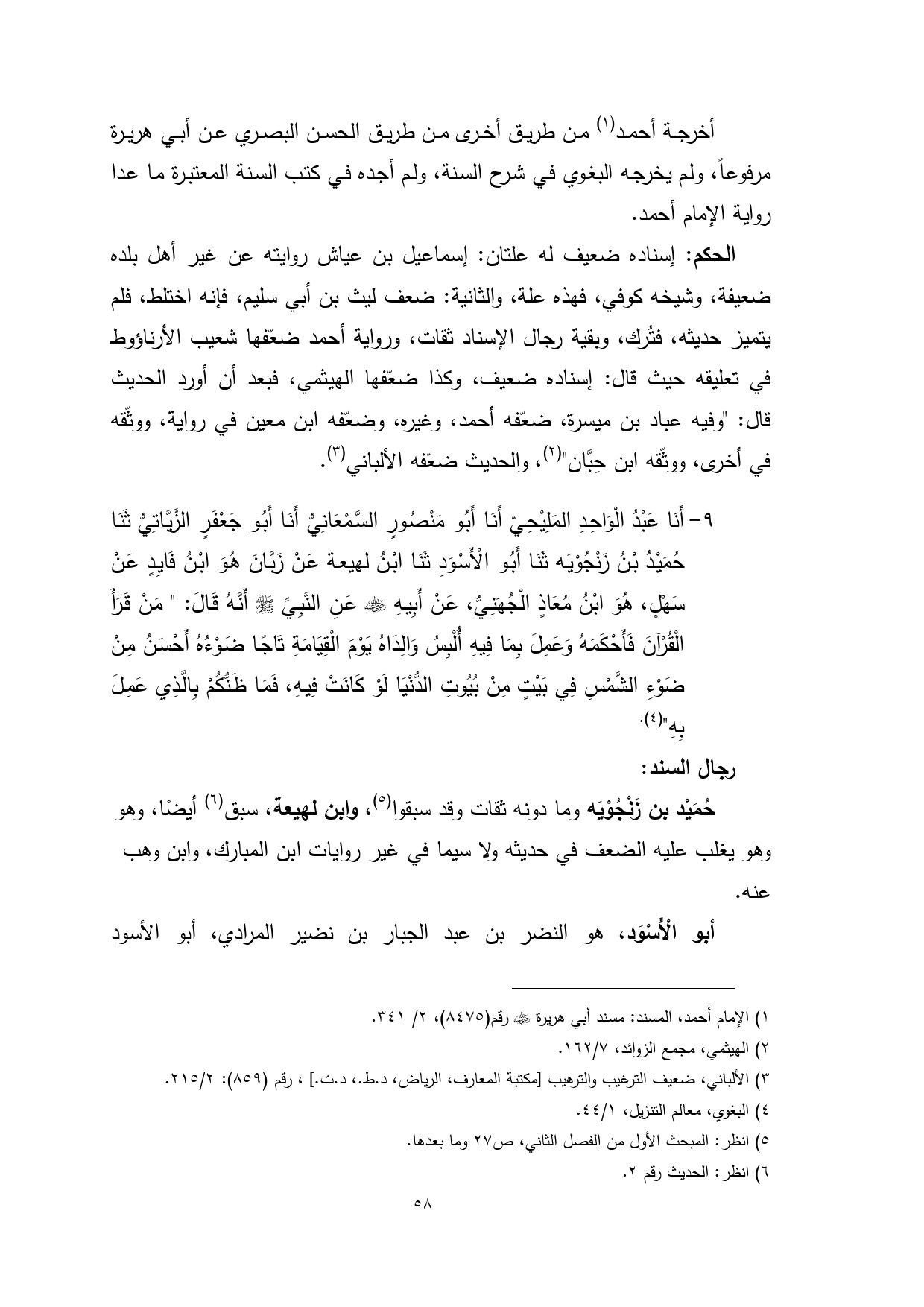 9 - أَنَا عَبْدُ الْوَاحِدِ المَلِيْحِيّ أَنَا أَبُو مَنْصُورٍ السَّمْعَانِيُّ أَنَا أَبُو جَعْفَرٍ الزَّيَّاتِيُّ ثَنَا حُمَيْدُ بْنُ زَنْجُوْيَه ثَنَا أَبُو الْأَسْوَدِ ثَنَا ابْنُ لهيعة عَنْ زَبَّانَ هُوَ ابْنُ فَايِدٍ عَنْ سَهْلٍ، هُوَ ابْنُ مُعَاذٍ الْجُهَنِيُّ، عَنْ أَبِيهِ - رضي الله عنه - عَنِ النَّبِيِّ - صلى الله عليه وسلم - أَنَّهُ قَالَ: " مَنْ قَرَأَ الْقُرْآنَ فَأَحْكَمَهُ وَعَمِلَ بِمَا فِيهِ أُلْبِسُ وَالِدَاهُ يَوْمَ الْقِيَامَةِ تَاجًا ضَوْءُهُ أَحْسَنُ مِنْ ضَوْءِ الشَّمْسِ فِي بَيْتٍ مِنْ بُيُوتِ الدُّنْيَا لَوْ كَانَتْ فِيهِ، فَمَا ظَنُّكُمْ بِالَّذِي عَمِلَ بِهِ" (¬4).