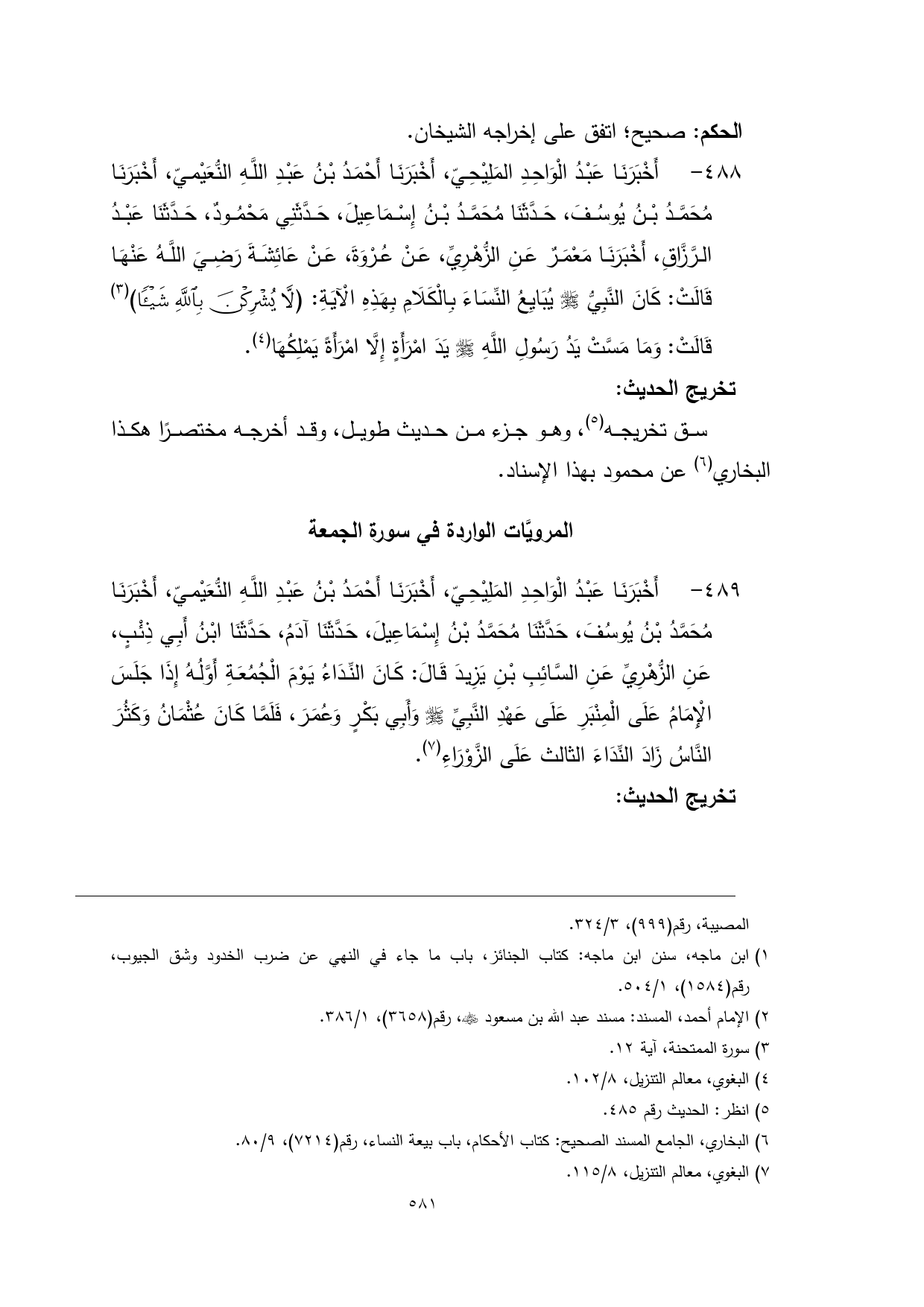 488 - أَخْبَرَنَا عَبْدُ الْوَاحِدِ المَلِيْحِيّ، أَخْبَرَنَا أَحْمَدُ بْنُ عَبْدِ اللَّهِ النُّعَيْميّ، أَخْبَرَنَا مُحَمَّدُ بْنُ يُوسُفَ، حَدَّثَنَا مُحَمَّدُ بْنُ إِسْمَاعِيلَ، حَدَّثَنِي مَحْمُودٌ، حَدَّثَنَا عَبْدُ الرَّزَّاقِ، أَخْبَرَنَا مَعْمَرٌ عَنِ الزُّهْرِيِّ، عَنْ عُرْوَةَ، عَنْ عَائِشَةَ رَضِيَ اللَّهُ عَنْهَا قَالَتْ: كَانَ النَّبِيُّ - صلى الله عليه وسلم - يُبَايِعُ النِّسَاءَ بِالْكَلَامِ بِهَذِهِ الْآيَةِ: {لَا يُشْرِكْنَ بِاللَّهِ شَيْئًا} (¬1) قَالَتْ: وَمَا مَسَّتْ يَدُ رَسُولِ اللَّهِ - صلى الله عليه وسلم - يَدَ امْرَأَةٍ إِلَّا امْرَأَةً يَمْلِكُهَا (¬2).