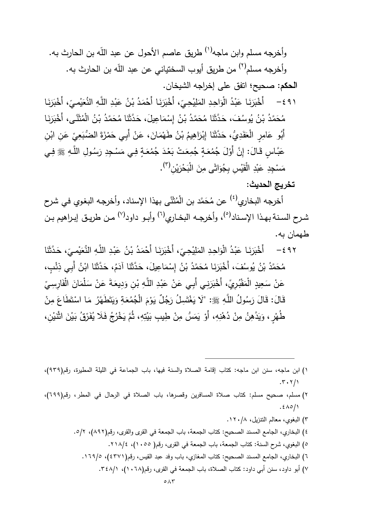 491 - أَخْبَرَنَا عَبْدُ الْوَاحِدِ المَلِيْحِيّ، أَخْبَرَنَا أَحْمَدُ بْنُ عَبْدِ اللَّهِ النُّعَيْميّ، أَخْبَرَنَا مُحَمَّدُ بْنُ يُوسُفَ، حَدَّثَنَا مُحَمَّدُ بْنُ إِسْمَاعِيلَ، حَدَّثَنَا مُحَمَّدُ بْنُ الْمُثَنَّى، أَخْبَرَنَا أَبُو عَامِرٍ الْعَقَدِيُّ، حَدَّثَنَا إِبْرَاهِيمُ بْنُ طَهْمَانَ، عَنْ أَبِي حَمْزَةَ الضُّبَعِيِّ عَنِ ابْنِ عَبَّاسٍ قَالَ: إِنَّ أَوَّلَ جُمُعَةٍ جُمِعَتْ بَعْدَ جُمُعَةٍ فِي مَسْجِدِ رَسُولِ اللَّهِ - صلى الله عليه وسلم - فِي مَسْجِدِ عَبْدِ الْقَيْسِ بِجُوَاثَى مِنَ الْبَحْرَيْنِ (¬3).