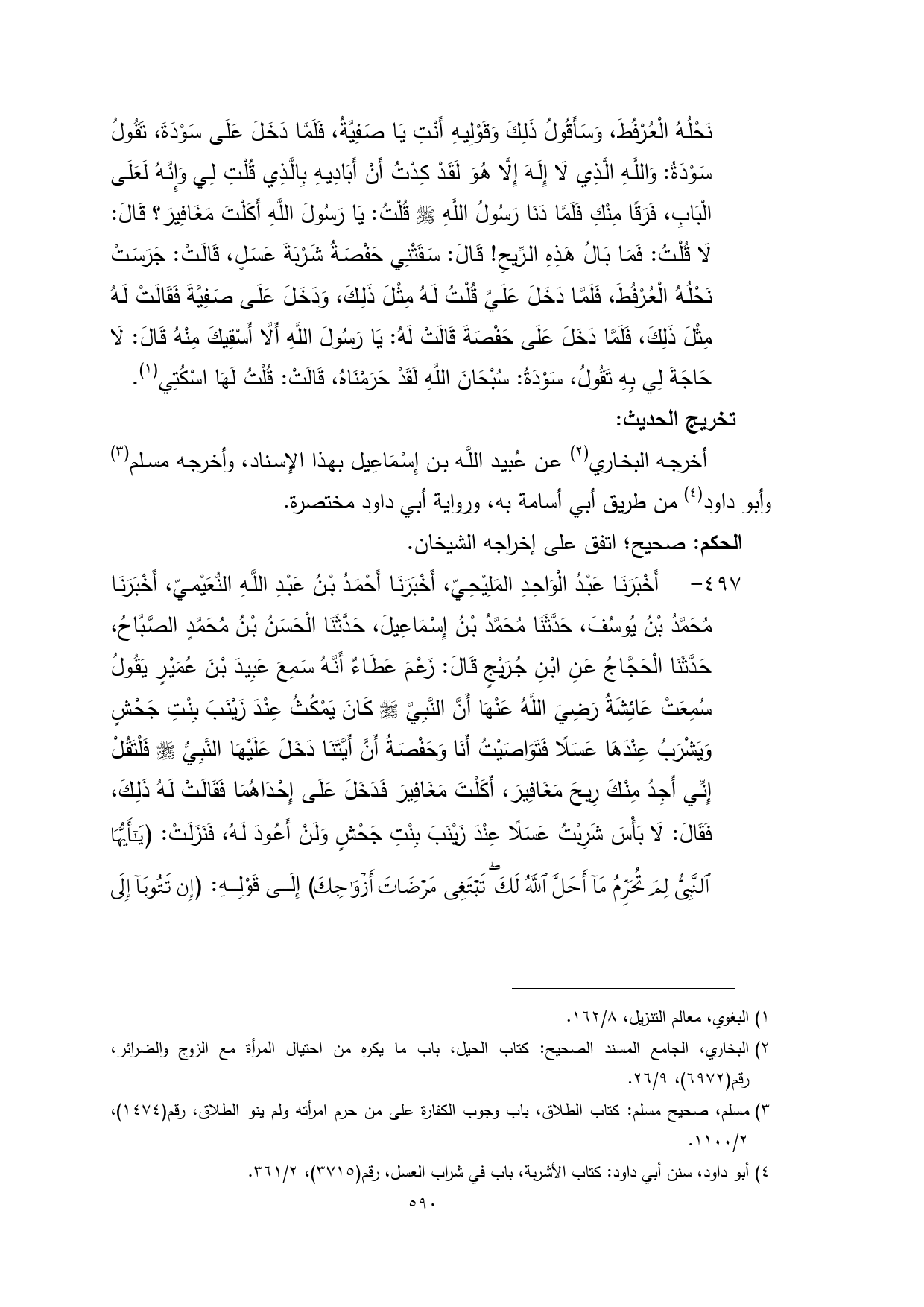 497 - أَخْبَرَنَا عَبْدُ الْوَاحِدِ المَلِيْحِيّ، أَخْبَرَنَا أَحْمَدُ بْنُ عَبْدِ اللَّهِ النُّعَيْميّ، أَخْبَرَنَا مُحَمَّدُ بْنُ يُوسُفَ، حَدَّثَنَا مُحَمَّدُ بْنُ إِسْمَاعِيلَ، حَدَّثَنَا الْحَسَنُ بْنُ مُحَمَّدٍ الصَّبَّاحُ، حَدَّثَنَا الْحَجَّاجُ عَنِ ابْنِ جُرَيْجٍ قَالَ: زَعْمَ عَطَاءٌ أَنَّهُ سَمِعَ عَبِيدَ بْنَ عُمَيْرٍ يَقُولُ سُمِعَتْ عَائِشَةُ رَضِيَ اللَّهُ عَنْهَا أَنَّ النَّبِيَّ - صلى الله عليه وسلم - كَانَ يَمْكُثُ عِنْدَ زَيْنَبَ بِنْتِ جَحْشٍ وَيَشْرَبُ عِنْدَهَا عَسَلًا فَتَوَاصَيْتُ أَنَا وَحَفْصَةُ أَنَّ أَيَّتَنَا دَخَلَ عَلَيْهَا النَّبِيُّ - صلى الله عليه وسلم - فَلْتَقُلْ إِنِّي أَجِدُ مِنْكَ رِيحَ مَغَافِيرَ، أَكَلْتَ مَغَافِيرَ فَدَخَلَ عَلَى إِحْدَاهُمَا فَقَالَتْ لَهُ ذَلِكَ، فَقَالَ: لَا بَأْسَ شَرِبْتُ عَسَلًا عِنْدَ زَيْنَبَ بِنْتِ جَحْشٍ وَلَنْ أَعُودَ لَهُ، فَنَزَلَتْ: {يَاأَيُّهَا النَّبِيُّ لِمَ تُحَرِّمُ مَا أَحَلَّ اللَّهُ لَكَ تَبْتَغِي مَرْضَاتَ أَزْوَاجِكَ} إِلَى قَوْلِهِ: {إِنْ تَتُوبَا إِلَى