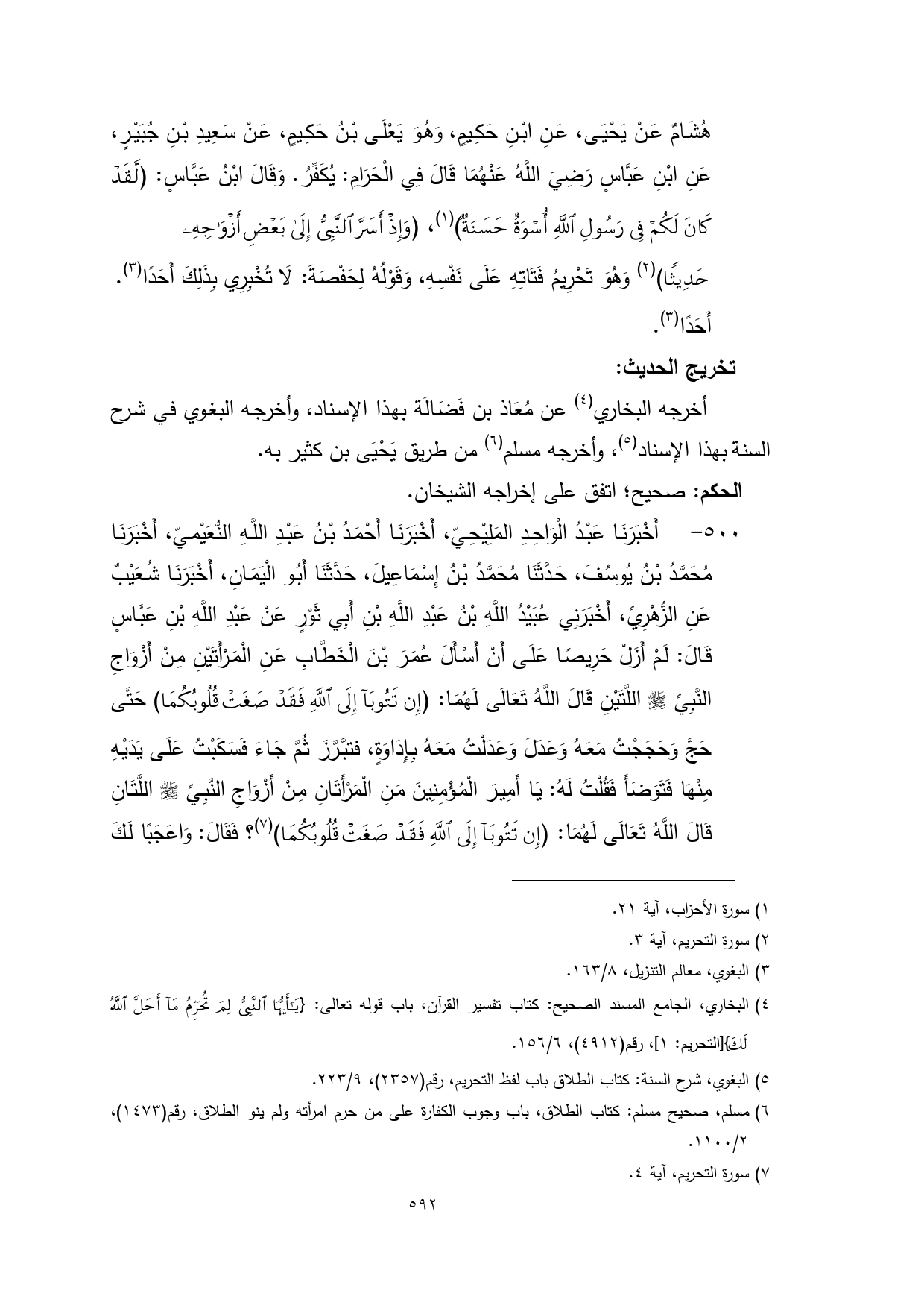 (¬4) البخاري، الجامع المسند الصحيح: كتاب تفسير القرآن، باب قوله تعالى: {يَا أَيُّهَا النَّبِيُّ لِمَ تُحَرِّمُ مَا أَحَلَّ اللَّهُ لَكَ} [التحريم: 1]، رقم (4912)، 6/ 156.