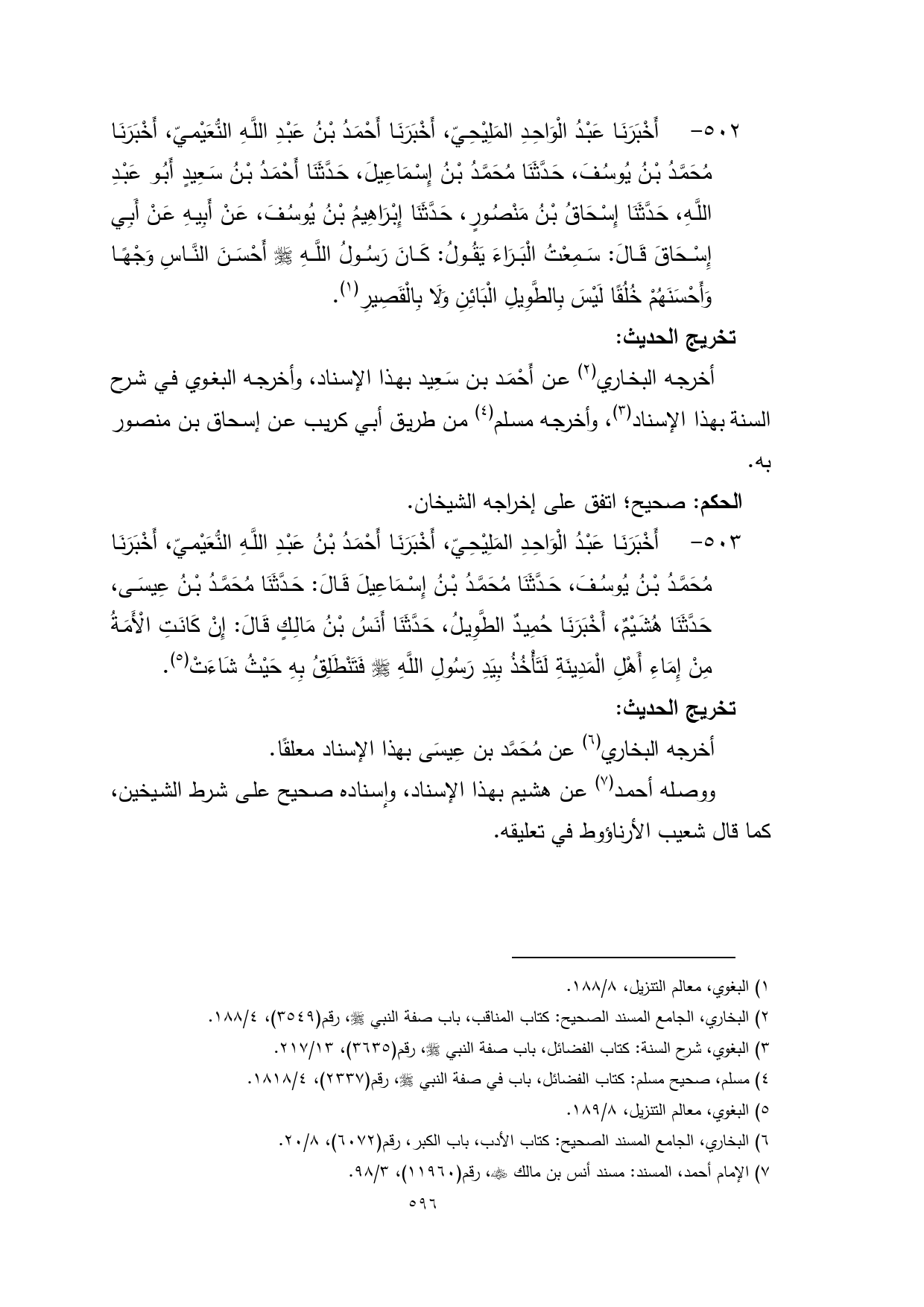 502 - أَخْبَرَنَا عَبْدُ الْوَاحِدِ المَلِيْحِيّ، أَخْبَرَنَا أَحْمَدُ بْنُ عَبْدِ اللَّهِ النُّعَيْميّ، أَخْبَرَنَا مُحَمَّدُ بْنُ يُوسُفَ، حَدَّثَنَا مُحَمَّدُ بْنُ إِسْمَاعِيلَ، حَدَّثَنَا أَحْمَدُ بْنُ سَعِيدٍ أَبُو عَبْدِ اللَّهِ، حَدَّثَنَا إِسْحَاقُ بْنُ مَنْصُورٍ، حَدَّثَنَا إِبْرَاهِيمُ بْنُ يُوسُفَ، عَنْ أَبِيهِ عَنْ أَبِي إِسْحَاقَ قَالَ: سَمِعْتُ الْبَرَاءَ يَقُولُ: كَانَ رَسُولُ اللَّهِ - صلى الله عليه وسلم - أَحْسَنَ النَّاسِ وَجْهًا وَأَحْسَنَهُمْ خُلُقًا لَيْسَ بِالطَّوِيلِ الْبَائِنِ وَلَا بِالْقَصِيرِ (¬1).