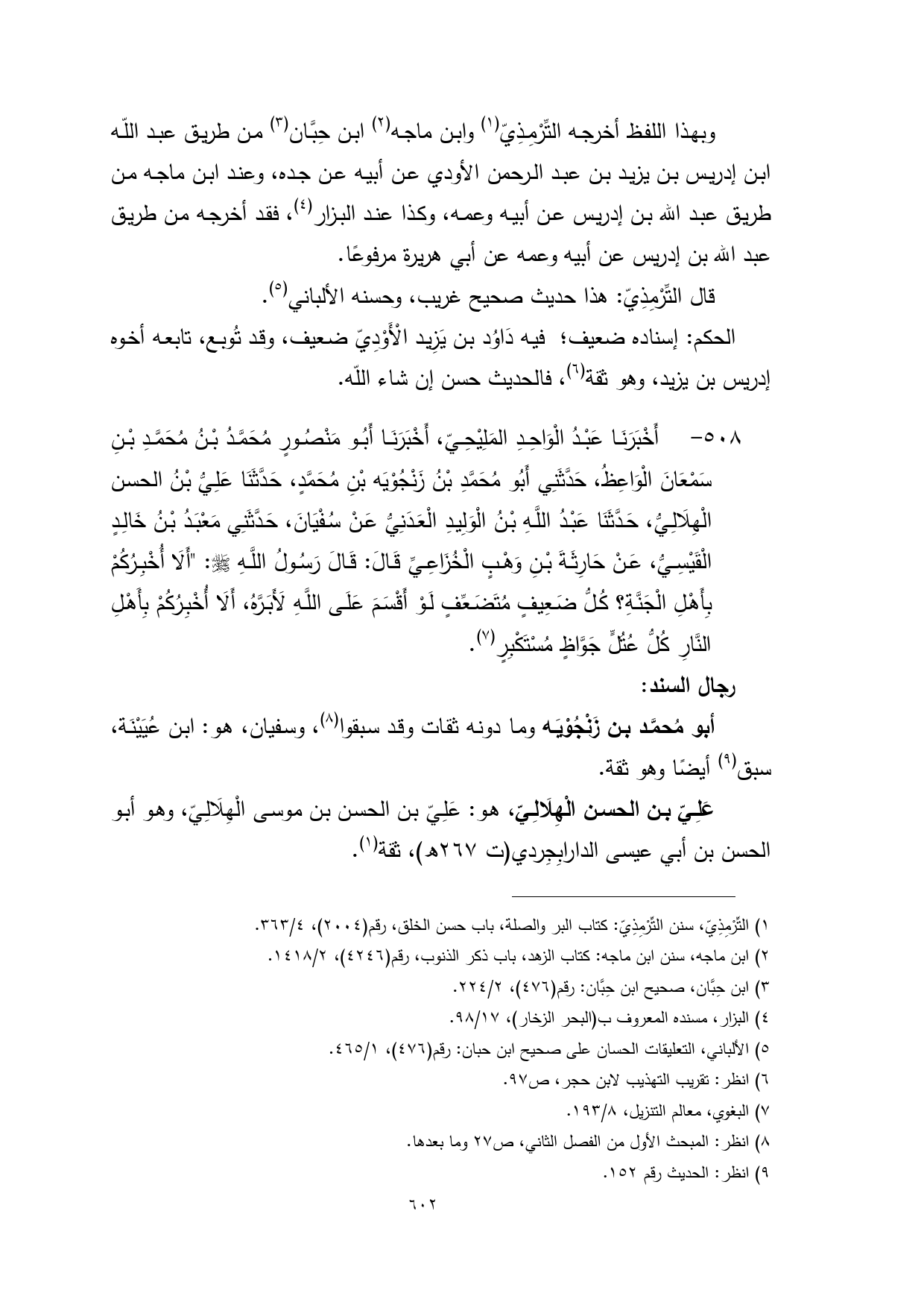 508 - أَخْبَرَنَا عَبْدُ الْوَاحِدِ المَلِيْحِيّ، أَخْبَرَنَا أَبُو مَنْصُورٍ مُحَمَّدُ بْنُ مُحَمَّدِ بْنِ سَمْعَانَ الْوَاعِظُ، حَدَّثَنِي أَبُو مُحَمَّدِ بْنُ زَنْجُوْيَه بْنِ مُحَمَّدٍ، حَدَّثَنَا عَلِيُّ بْنُ الحسن الْهِلَالِيُّ، حَدَّثَنَا عَبْدُ اللَّهِ بْنُ الْوَلِيدِ الْعَدَنِيُّ عَنْ سُفْيَانَ، حَدَّثَنِي مَعْبَدُ بْنُ خَالِدٍ الْقَيْسِيُّ، عَنْ حَارِثَةَ بْنِ وَهْبٍ الْخُزَاعِيِّ قَالَ: قَالَ رَسُولُ اللَّهِ - صلى الله عليه وسلم -: "أَلَا أُخْبِرُكُمْ بِأَهْلِ الْجَنَّةِ؟ كُلُّ ضَعِيفٍ مُتَضَعِّفٍ لَوْ أَقْسَمَ عَلَى اللَّهِ لَأَبَرَّهُ، أَلَا أُخْبِرُكُمْ بِأَهْلِ النَّارِ كُلُّ عُتُلٍّ جَوَّاظٍ مُسْتَكْبِرٍ (¬7).
