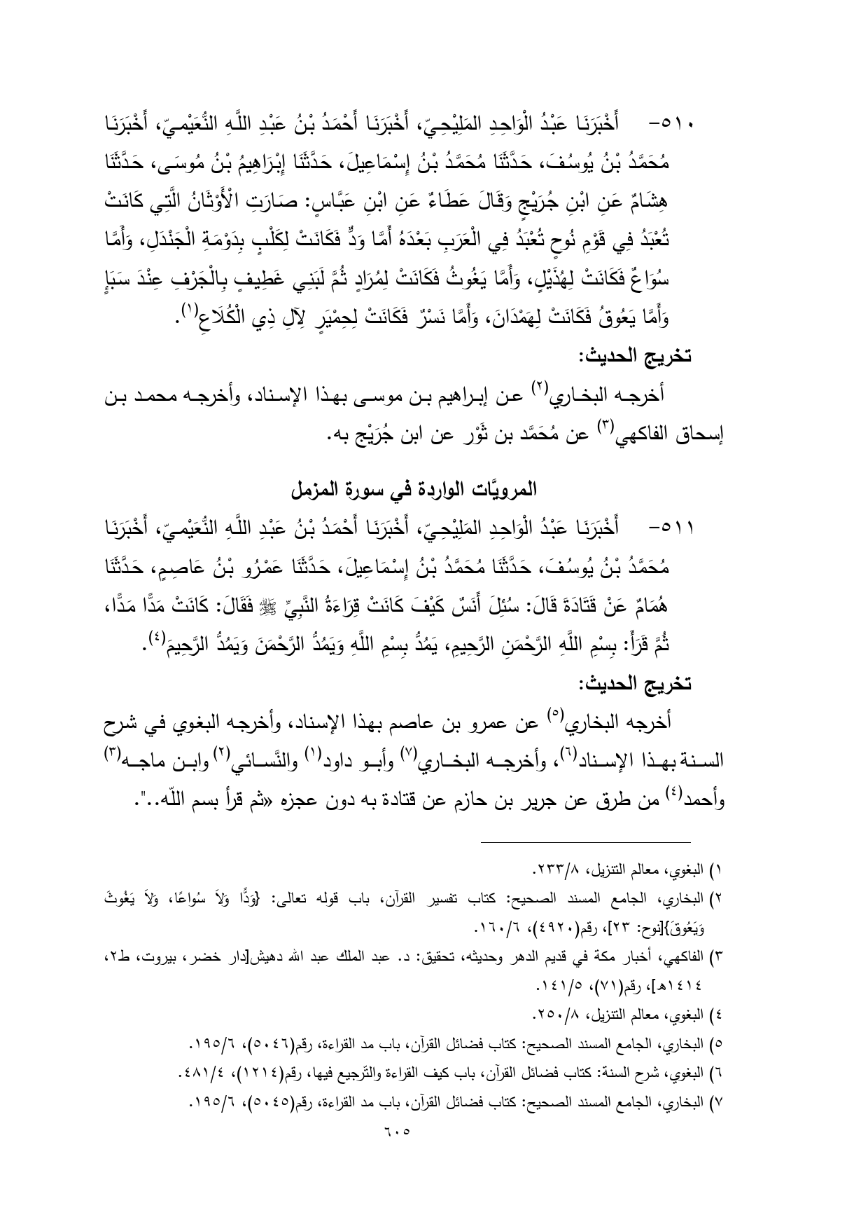 510 - أَخْبَرَنَا عَبْدُ الْوَاحِدِ المَلِيْحِيّ، أَخْبَرَنَا أَحْمَدُ بْنُ عَبْدِ اللَّهِ النُّعَيْميّ، أَخْبَرَنَا مُحَمَّدُ بْنُ يُوسُفَ، حَدَّثَنَا مُحَمَّدُ بْنُ إِسْمَاعِيلَ، حَدَّثَنَا إِبْرَاهِيمُ بْنُ مُوسَى، حَدَّثَنَا هِشَامٌ عَنِ ابْنِ جُرَيْجٍ وَقَالَ عَطَاءٌ عَنِ ابْنِ عَبَّاسٍ: صَارَتِ الْأَوْثَانُ الَّتِي كَانَتْ تُعْبَدُ فِي قَوْمِ نُوحٍ تُعْبَدُ فِي الْعَرَبِ بَعْدَهُ أَمَّا وَدٌّ فَكَانَتْ لِكَلْبٍ بِدَوْمَةِ الْجَنْدَلِ، وَأَمَّا سُوَاعٌ فَكَانَتْ لِهُذَيْلٍ، وَأَمَّا يَغُوثُ فَكَانَتْ لِمُرَادٍ ثُمَّ لَبَنِي غَطِيفٍ بِالْجَرْفِ عِنْدَ سَبَإٍ وَأَمَّا يَعُوقُ فَكَانَتْ لِهَمْدَانَ، وَأَمَّا نَسْرٌ فَكَانَتْ لِحِمْيَرٍ لِآلِ ذِي الْكُلَاعِ (¬1).
