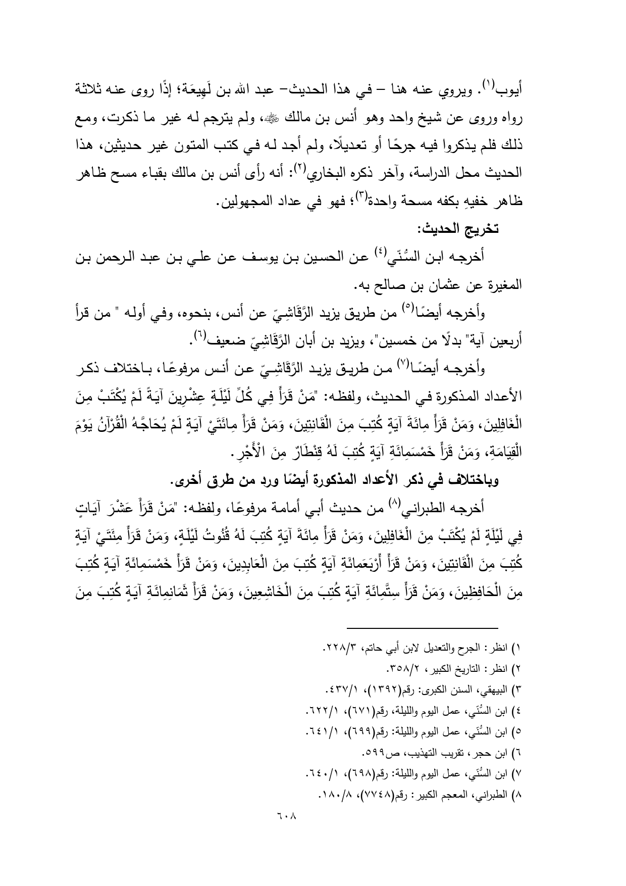 أيوب (¬1). ويروي عنه هنا - في هذا الحديث- عبد الله بن لَهِيعَة؛ إذًا روى عنه ثلاثة رواه وروى عن شيخ واحد وهو أنس بن مالك - رضي الله عنه -، ولم يترجم له غير ما ذكرت، ومع ذلك فلم يذكروا فيه جرحًا أو تعديلًا، ولم أجد له في كتب المتون غير حديثين، هذا الحديث محل الدراسة، وآخر ذكره البخاري (¬2): أنه رأى أنس بن مالك بقباء مسح ظاهر خفيهِ بكفه مسحة واحدة (¬3)؛ فهو في عداد المجهولين.