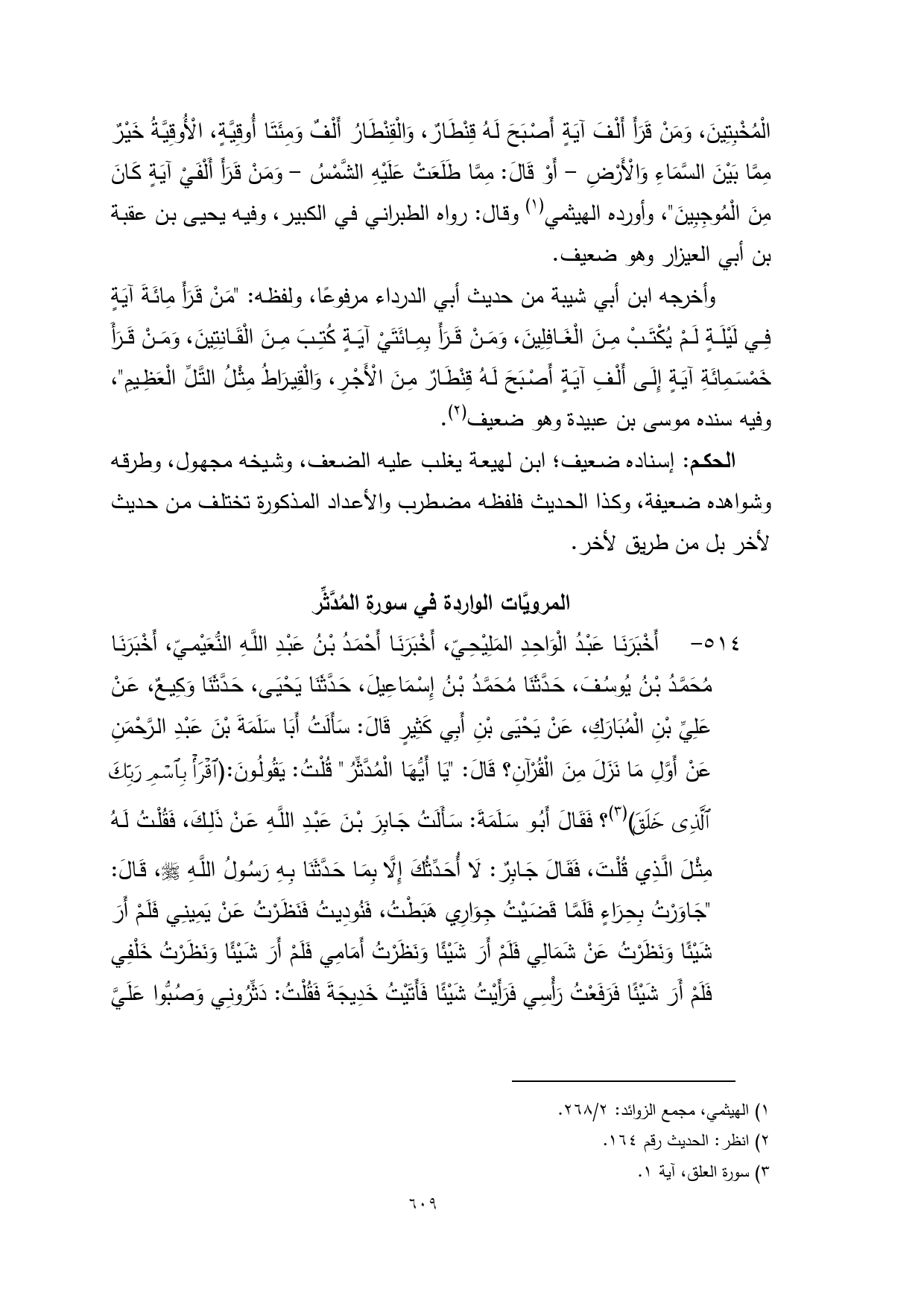 514 - أَخْبَرَنَا عَبْدُ الْوَاحِدِ المَلِيْحِيّ، أَخْبَرَنَا أَحْمَدُ بْنُ عَبْدِ اللَّهِ النُّعَيْميّ، أَخْبَرَنَا مُحَمَّدُ بْنُ يُوسُفَ، حَدَّثَنَا مُحَمَّدُ بْنُ إِسْمَاعِيلَ، حَدَّثَنَا يَحْيَى، حَدَّثَنَا وَكِيعٌ، عَنْ عَلِيِّ بْنِ الْمُبَارَكِ، عَنْ يَحْيَى بْنِ أَبِي كَثِيرٍ قَالَ: سَأَلَتُ أَبَا سَلَمَةَ بْنَ عَبْدِ الرَّحْمَنِ عَنْ أَوَّلِ مَا نَزَلَ مِنَ الْقُرْآنِ؟ قَالَ: "يَا أَيُّهَا الْمُدَّثِّرُ" قُلْتُ: يَقُولُونَ: {اقْرَأْ بِاسْمِ رَبِّكَ الَّذِي خَلَقَ} (¬3)؟ فَقَالَ أَبُو سَلَمَةَ: سَأَلَتُ جَابِرَ بْنَ عَبْدِ اللَّهِ عَنْ ذَلِكَ، فَقُلْتُ لَهُ مِثْلَ الَّذِي قُلْتَ، فَقَالَ جَابِرٌ: لَا أُحَدِّثُكَ إِلَّا بِمَا حَدَّثَنَا بِهِ رَسُولُ اللَّهِ - صلى الله عليه وسلم -، قَالَ: "جَاوَرْتُ بِحِرَاءٍ فَلَمَّا قَضَيْتُ جِوَارِي هَبَطْتُ، فَنُودِيتُ فَنَظَرْتُ عَنْ يَمِينِي فَلَمْ أَرَ شَيْئًا وَنَظَرْتُ عَنْ شَمَالِي فَلَمْ أَرَ شَيْئًا وَنَظَرْتُ أَمَامِي فَلَمْ أَرَ شَيْئًا وَنَظَرْتُ خَلْفِي فَلَمْ أَرَ شَيْئًا فَرَفَعْتُ رَأْسِي فَرَأَيْتُ شَيْئًا فَأَتَيْتُ خَدِيجَةَ فَقُلْتُ: دَثِّرُونِي وَصُبُّوا عَلَيَّ